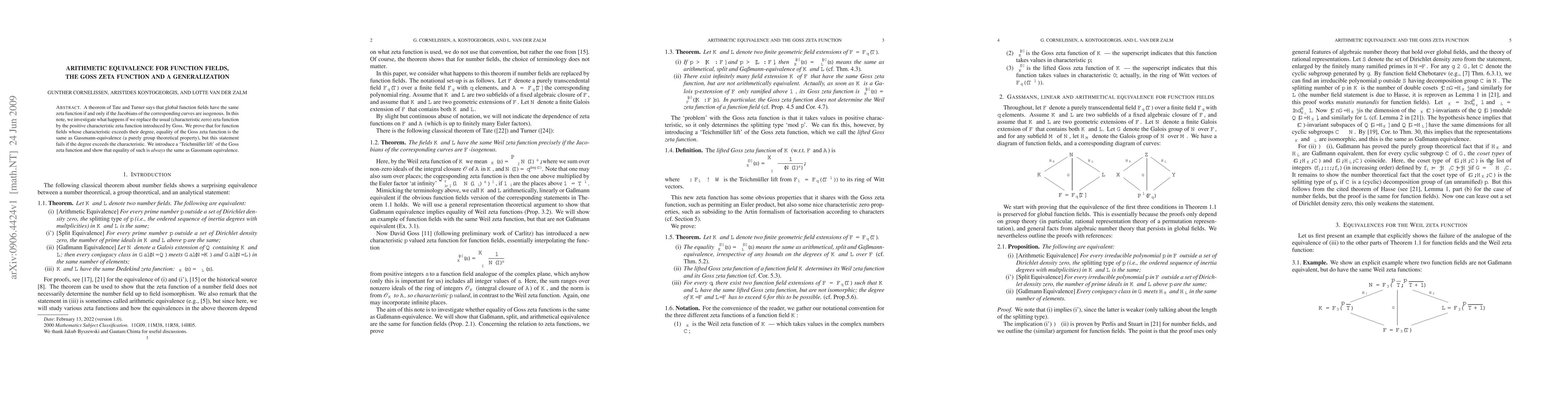 A theorem of Tate and Turner says that global function fields have the same zeta function if and only if the Jacobians of the corresponding curves are isogenous. In this note, we investigate what happens if we replace the usual (characteristic zero) zeta function by the positive characteristic zeta function introduced by Goss. We prove that for function fields whose characteristic exceeds their degree, equality of the Goss zeta function is the same as Gassmann-equivalence (a purely group theoretical property), but this statement fails if the degree exceeds the characteristic. We introduce a `Teichmueller lift' of the Goss zeta function and show that equality of such is always the same as Gassmann equivalence.