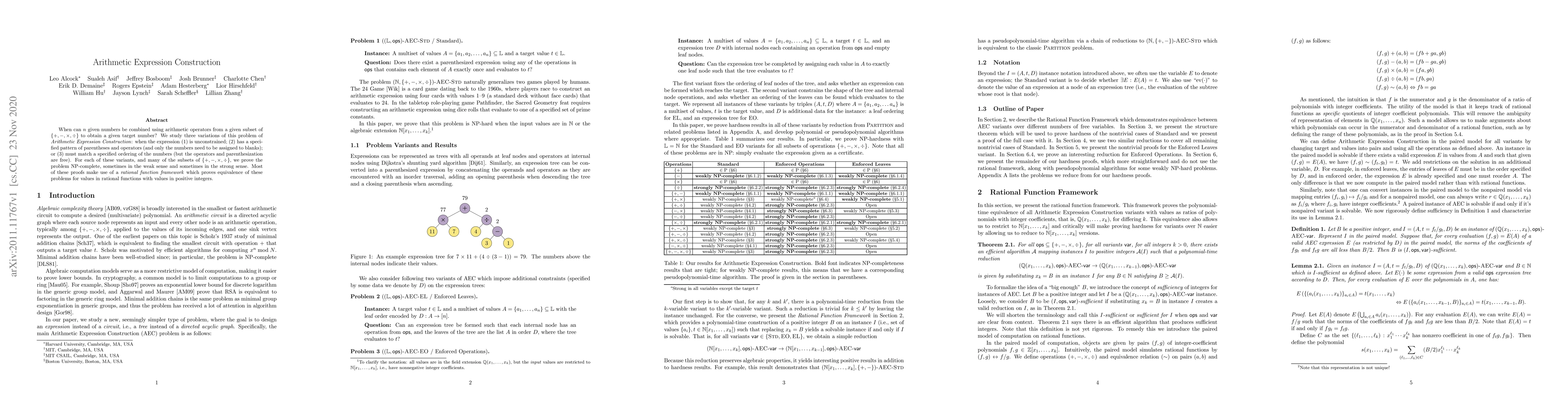 When can $n$ given numbers be combined using arithmetic operators from a given subset of $\{+, -, \times, \div\}$ to obtain a given target number? We study three variations of this problem of Arithmetic Expression Construction: when the expression (1) is unconstrained; (2) has a specified pattern of parentheses and operators (and only the numbers need to be assigned to blanks); or (3) must match a specified ordering of the numbers (but the operators and parenthesization are free). For each of these variants, and many of the subsets of $\{+,-,\times,\div\}$, we prove the problem NP-complete, sometimes in the weak sense and sometimes in the strong sense. Most of these proofs make use of a "rational function framework" which proves equivalence of these problems for values in rational functions with values in positive integers.