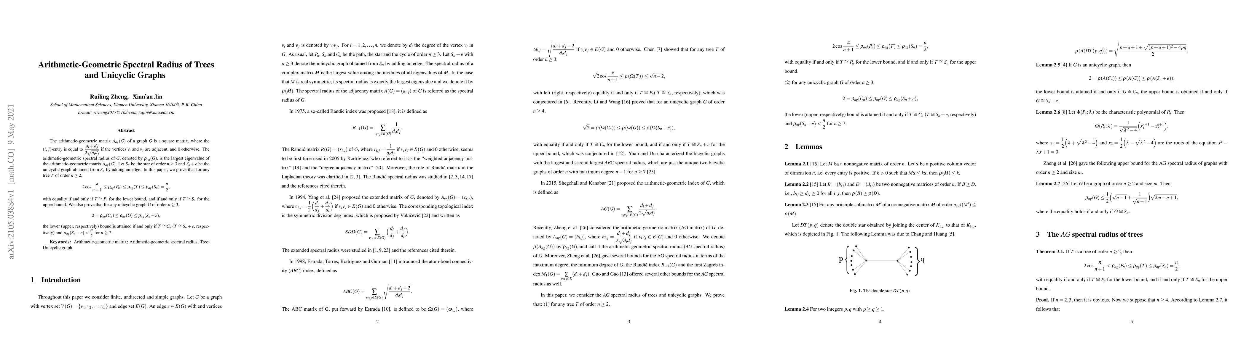 This paper investigates the arithmetic-geometric spectral radius of trees and unicyclic graphs, showing that for trees, $\rho_{ag}(T)$ is bounded between $\rho_{ag}(P_{n})$ and $\rho_{ag}(S_{n})$, with specific conditions for equality. For unicyclic graphs, $\rho_{ag}(G)$ is bounded by $\rho_{ag}(C_{n})$ and $\rho_{ag}(S_{n}+e)$, with $\rho_{ag}(S_{n}+e) < \frac{n}{2}$ for $n \geq 7$.