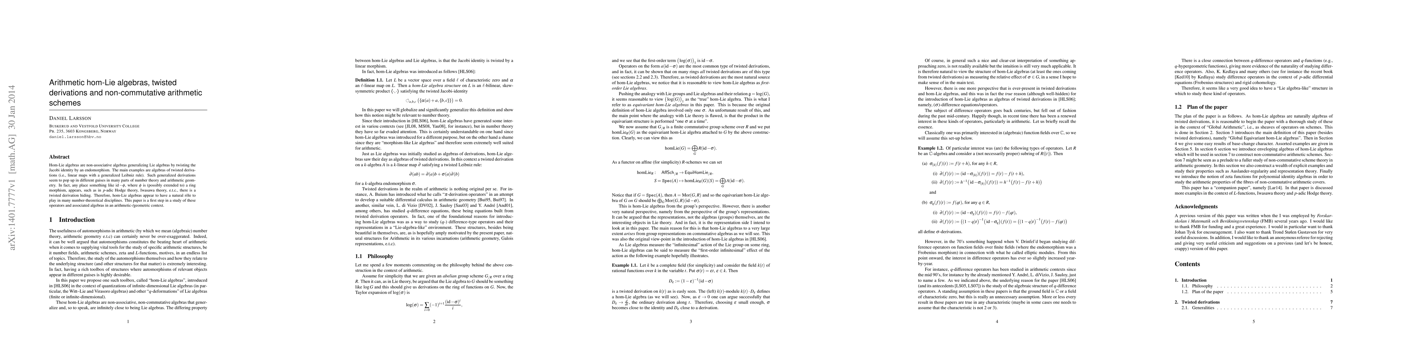 Hom-Lie algebras are non-associative algebras generalizing Lie algebras by twisting the Jacobi identity by an endomorphism. The main examples are algebras of twisted derivations (i.e., linear maps with a generalized Leibniz rule). Such generalized derivations seem to pop up in different guises in many parts of number theory and arithmetic geometry. In fact, any place something like $\mathrm{id}-\phi$, where $\phi$ is (possibly extended to) a ring morphism, appears, such as in $p$-adic Hodge theory, Iwasawa theory, e.t.c., there is a twisted derivation hiding. Therefore, hom-Lie algebras appear to have a natural r\^ole to play in many number-theoretical disciplines. This paper is a first step in a study of these operators and associated algebras in an arithmetic-/geometric context.
