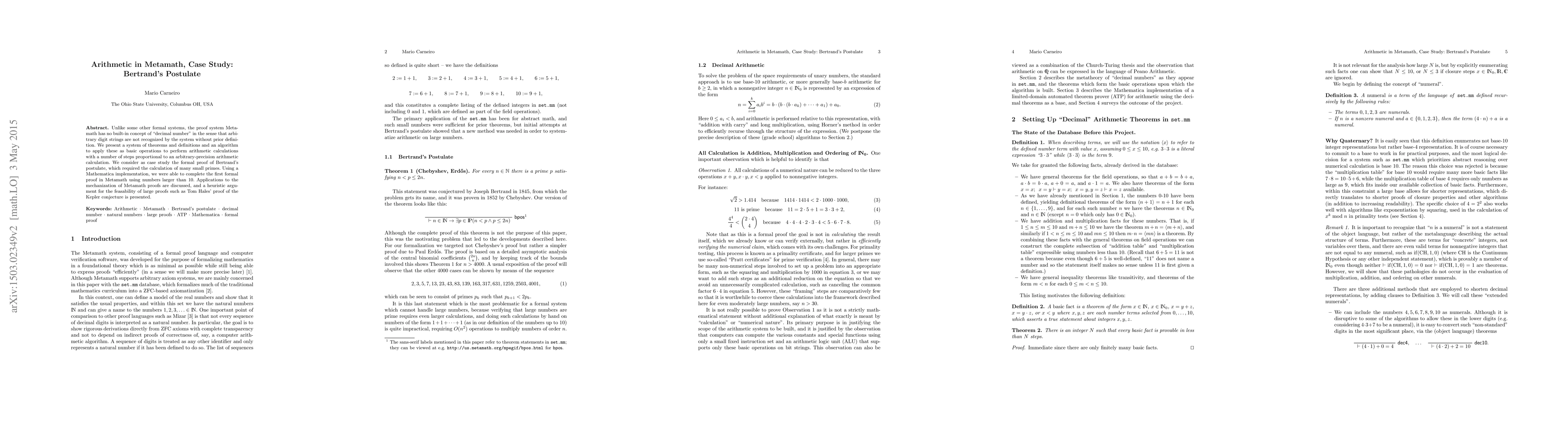 This paper details a method for performing arithmetic in Metamath without built-in decimal number support, focusing on a formal proof of Bertrand's postulate using defined algorithms. It demonstrates the feasibility of large proofs in Metamath, hinting at potential applications to proofs like Tom Hales' Kepler conjecture.