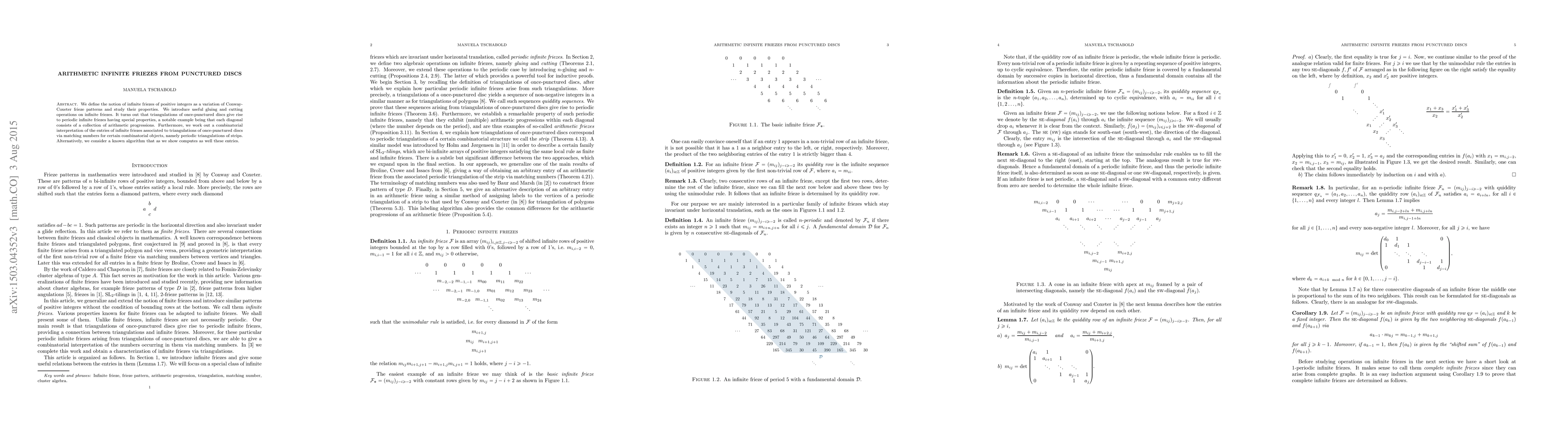 This paper defines infinite friezes of positive integers, exploring their properties and operations, and shows that triangulations of once-punctured discs generate periodic infinite friezes with arithmetic progressions on each diagonal. It also provides a combinatorial interpretation of these friezes through matching numbers of periodic triangulations of strips.