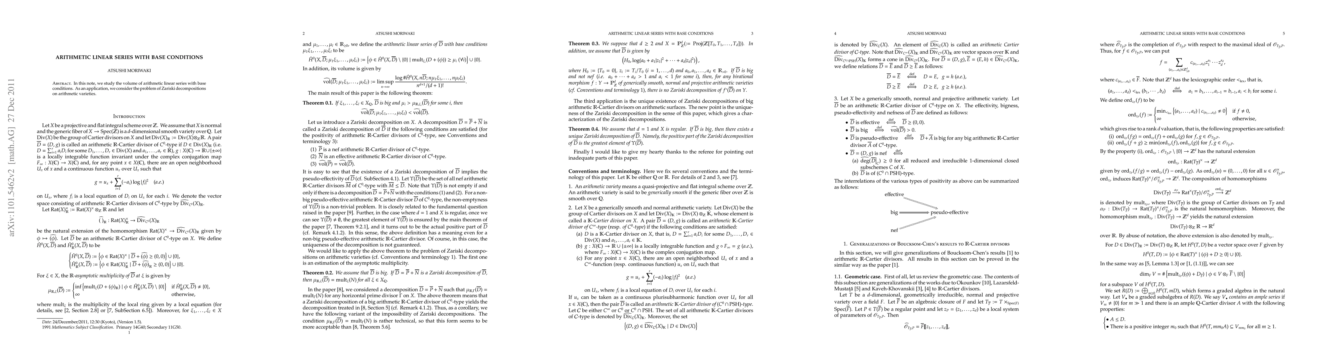 This paper investigates the volume of arithmetic linear series under specific base conditions and applies the findings to explore Zariski decompositions on arithmetic varieties. The study enhances understanding of the geometric properties of these decompositions.