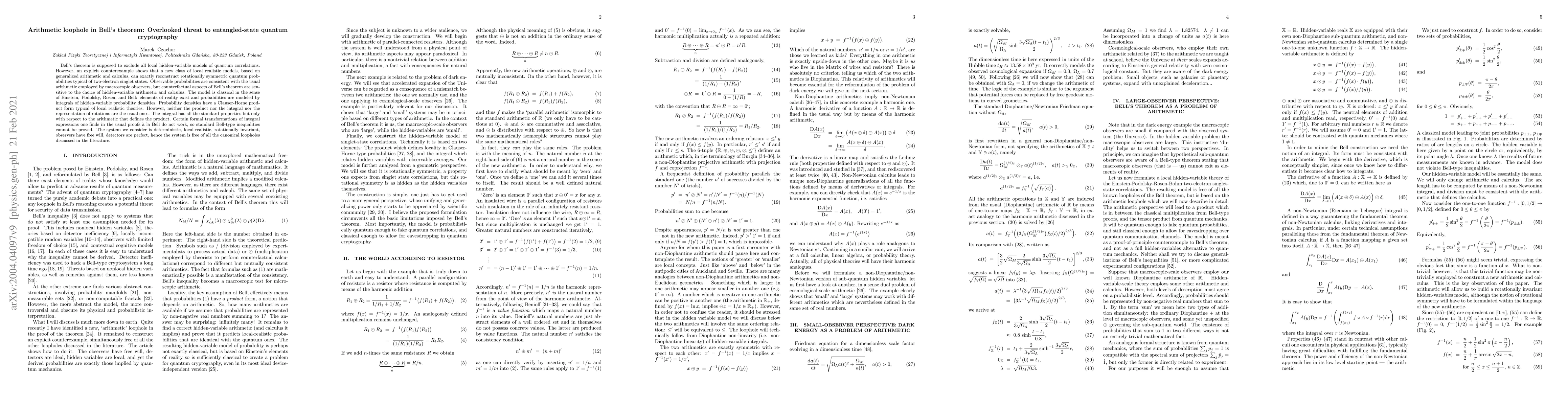 This paper reveals a loophole in Bell's theorem through a new class of local realistic models using generalized arithmetic and calculus, which can reconstruct quantum probabilities without violating local realism. Standard Bell-type inequalities fail due to non-standard arithmetic, posing a threat to entangled-state quantum cryptography.