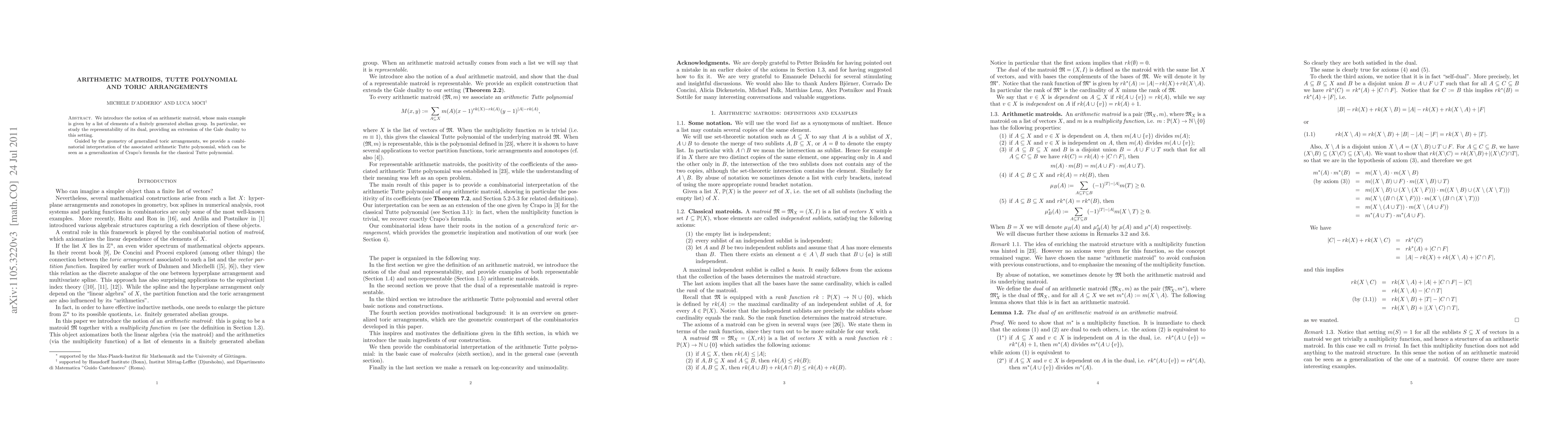 Summary: This paper introduces arithmetic matroids, particularly those derived from finitely generated abelian groups, and extends Gale duality to this context. It also provides a combinatorial interpretation of the arithmetic Tutte polynomial, generalizing Crapo's formula, using the geometry of generalized toric arrangements.