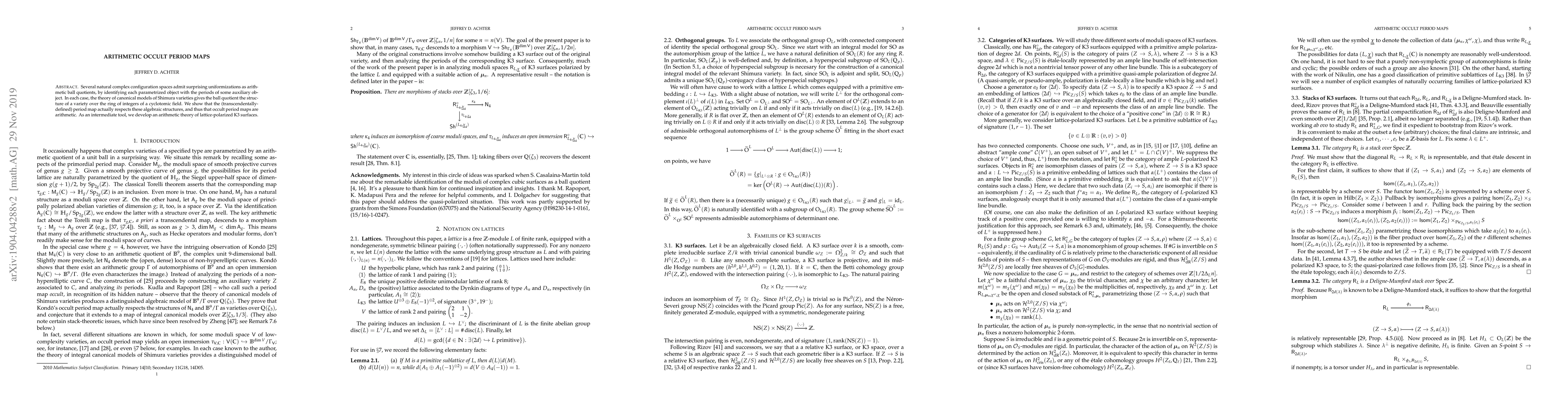Several natural complex configuration spaces admit surprising uniformizations as arithmetic ball quotients, by identifying each parametrized object with the periods of some auxiliary object. In each case, the theory of canonical models of Shimura varieties gives the ball quotient the structure of a variety over the ring of integers of a cyclotomic field. We show that the (transcendentally-defined) period map actually respects these algebraic structures, and thus that occult period maps are arithmetic. As an intermediate tool, we develop an arithmetic theory of lattice-polarized K3 surfaces.
