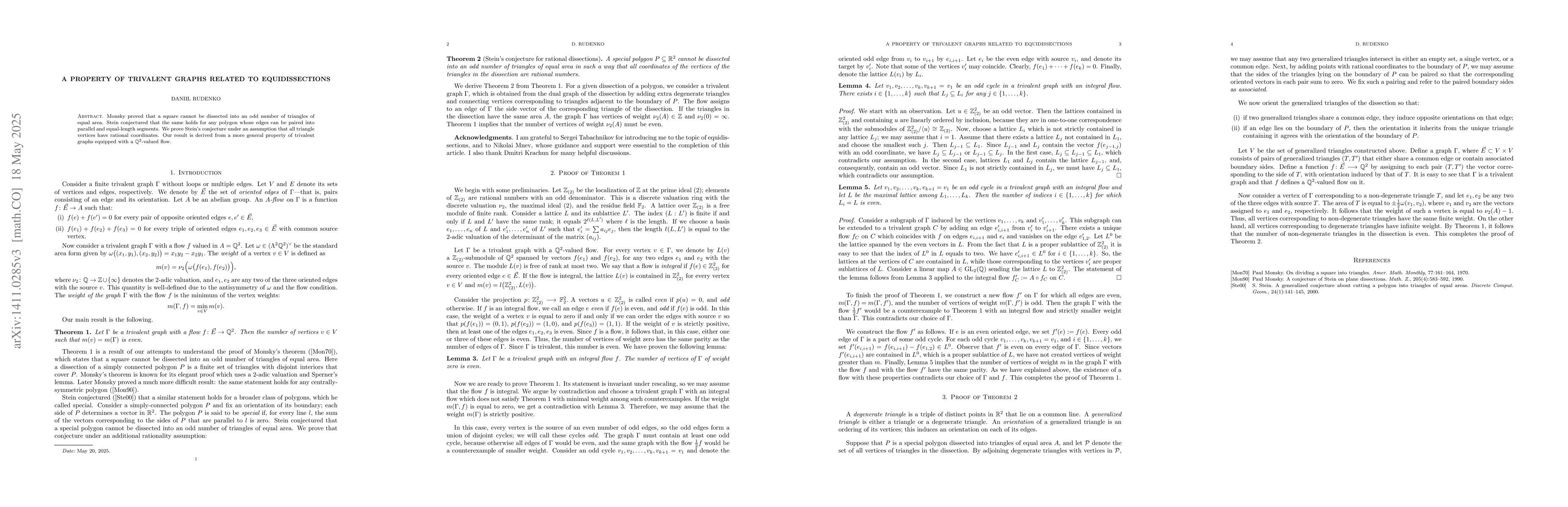 Researchers study 3-valent graphs with vector functions on edges to prove that rational balanced polygons cannot be cut into an odd number of equal-area triangles, extending previous results from a square and a conjecture by Sherman Stein.