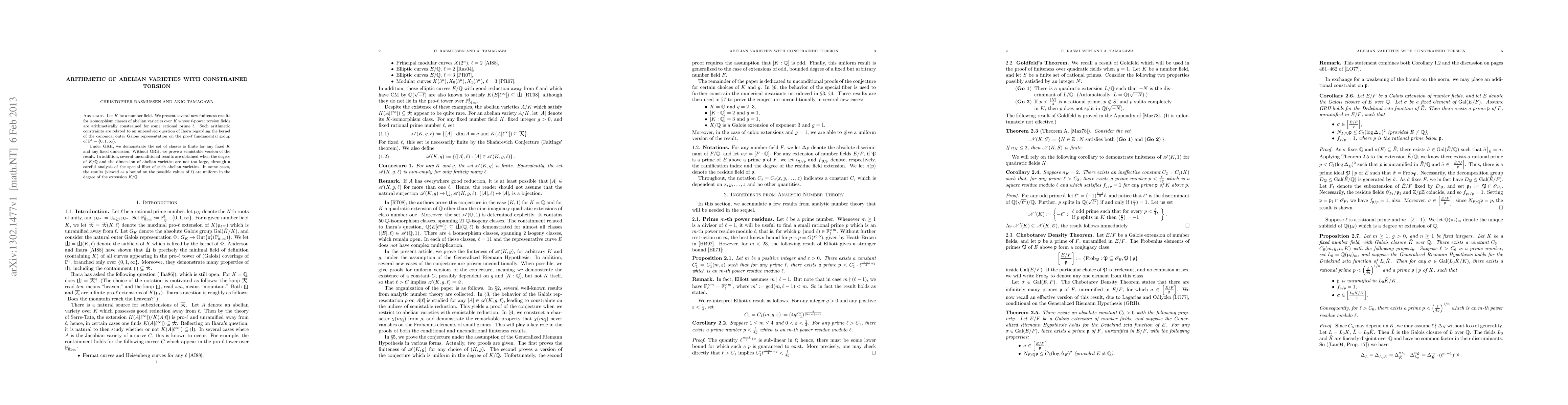 Let $K$ be a number field. We present several new finiteness results for isomorphism classes of abelian varieties over $K$ whose $\ell$-power torsion fields are arithmetically constrained for some rational prime $\ell$. Such arithmetic constraints are related to an unresolved question of Ihara regarding the kernel of the canonical outer Galois representation on the pro-$\ell$ fundamental group of $P^1 - \{0,1,\infty\}$. Under GRH, we demonstrate the set of classes is finite for any fixed $K$ and any fixed dimension. Without GRH, we prove a semistable version of the result. In addition, several unconditional results are obtained when the degree of $K/\Q$ and the dimension of abelian varieties are not too large, through a careful analysis of the special fiber of such abelian varieties. In some cases, the results (viewed as a bound on the possible values of $\ell$) are uniform in the degree of the extension $K/\Q$.