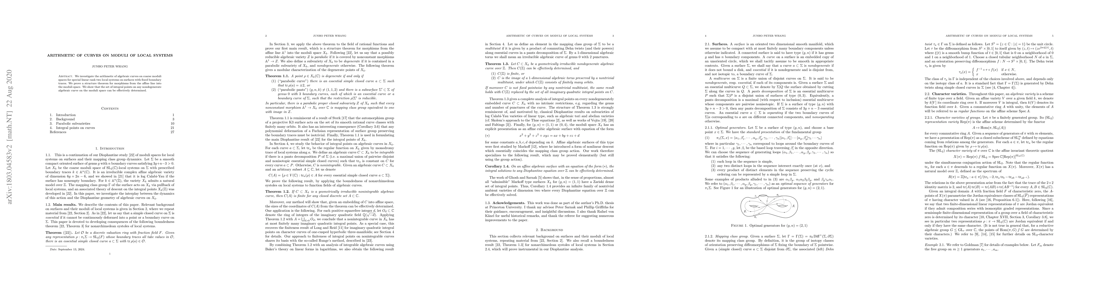 The paper proves a structure theorem for morphisms from the affine line to moduli spaces of rank two local systems on surfaces and demonstrates a method for determining the integral points on nondegenerate algebraic curves within these spaces.