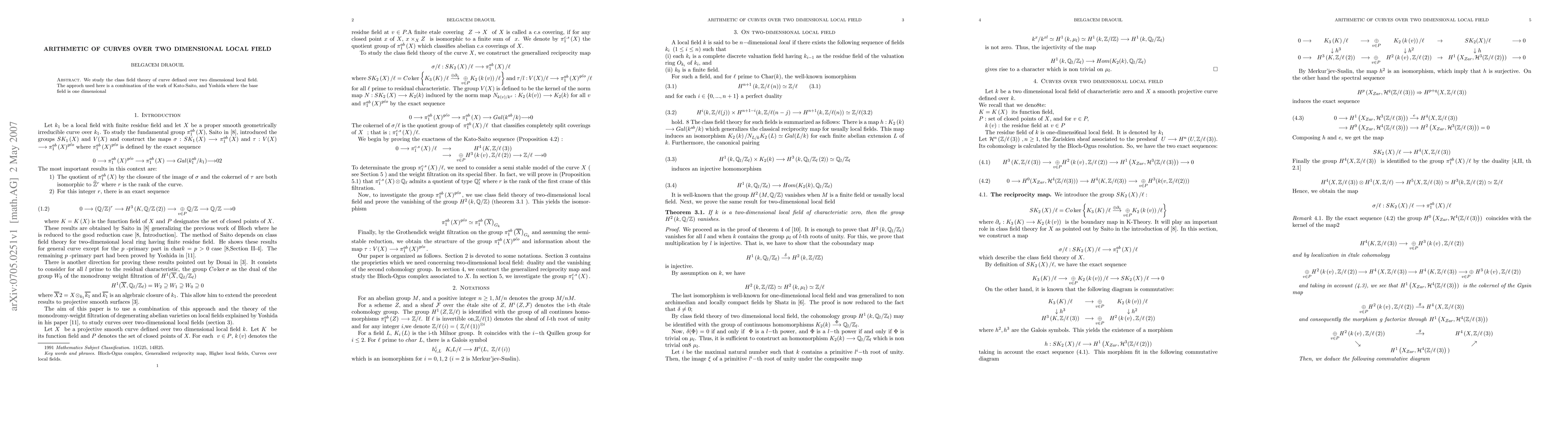We study the class field theory of curve defined over two dimensional local field. The approch used here is a combination of the work of Kato-Saito, and Yoshida where the base field is one dimensional