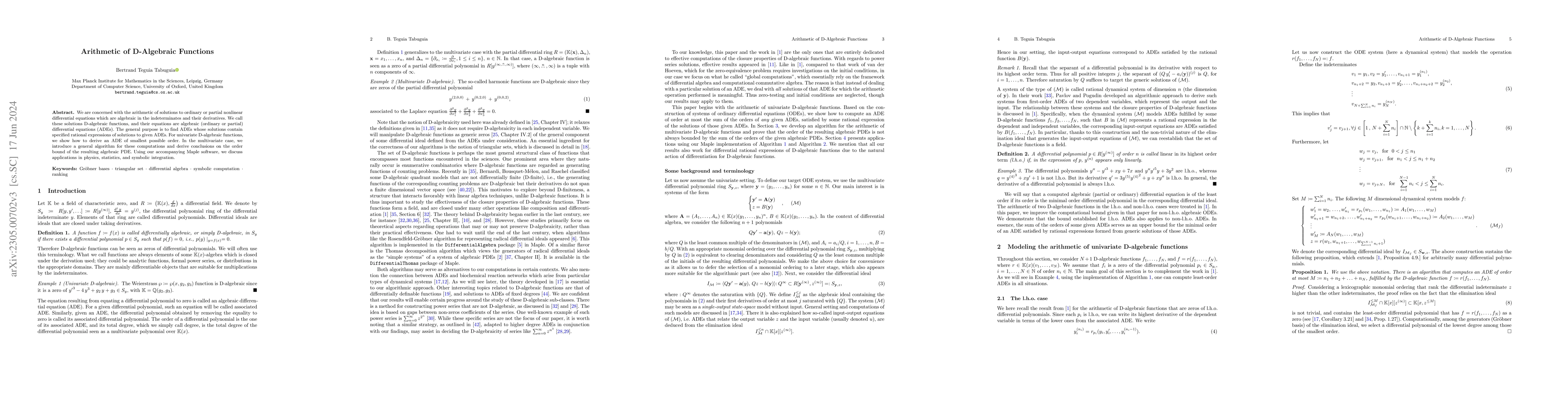 This paper investigates the arithmetic of D-algebraic functions, which are solutions to algebraic differential equations. It proposes methods to derive minimal order ADEs for univariate cases and introduces an algorithm for multivariate scenarios, with applications in physics, statistics, and symbolic integration using Maple software.