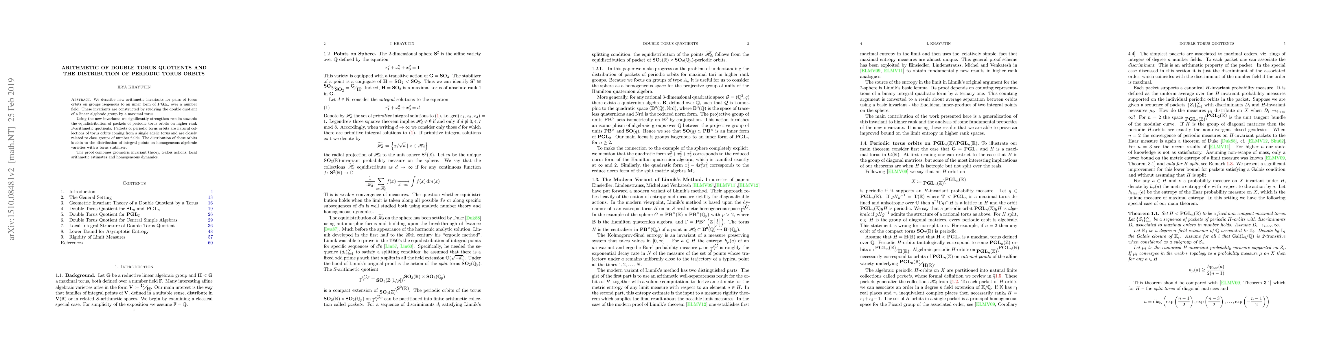 We describe new arithmetic invariants for pairs of torus orbits on groups isogenous to an inner form of $\mathbf{PGL}_n$ over a number field. These invariants are constructed by studying the double quotient of a linear algebraic group by a maximal torus. Using the new invariants we significantly strengthen results towards the equidistribution of packets of periodic torus orbits on higher rank $S$-arithmetic quotients. Packets of periodic torus orbits are natural collections of torus orbits coming from a single adelic torus and are closely related to class groups of number fields. The distribution of these orbits is akin to the distribution of integral points on homogeneous algebraic varieties with a torus stabilizer. The proof combines geometric invariant theory, Galois actions, local arithmetic estimates and homogeneous dynamics.