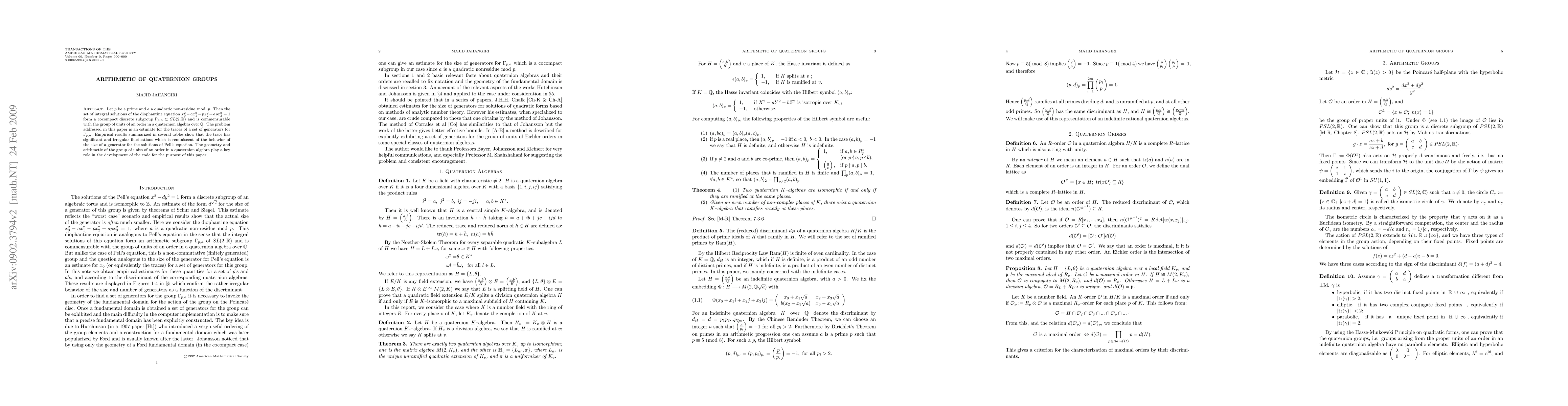 Let $p$ be a prime and $a$ a quadratic non-residue $\bmod p$. Then the set of integral solutions of the diophantine equation $x_0^2 - ax_1^2 -px_2^2 + apx_3^2=1$ form a cocompact discrete subgroup $\Gamma_{p,a}\subset SL(2,\mathbb{R})$ and is commensurable with the group of units of an order in a quaternion algebra over $\mathbb{Q}$. The problem addressed in this paper is an estimate for the traces of a set of generators for $\Gamma_{p,a}$. Empirical results summarized in several tables show that the trace has significant and irregular fluctuations which is reminiscent of the behavior of the size of a generator for the solutions of Pell's equation. The geometry and arithmetic of the group of units of an order in a quaternion algebra play a key role in the development of the code for the purpose of this paper.