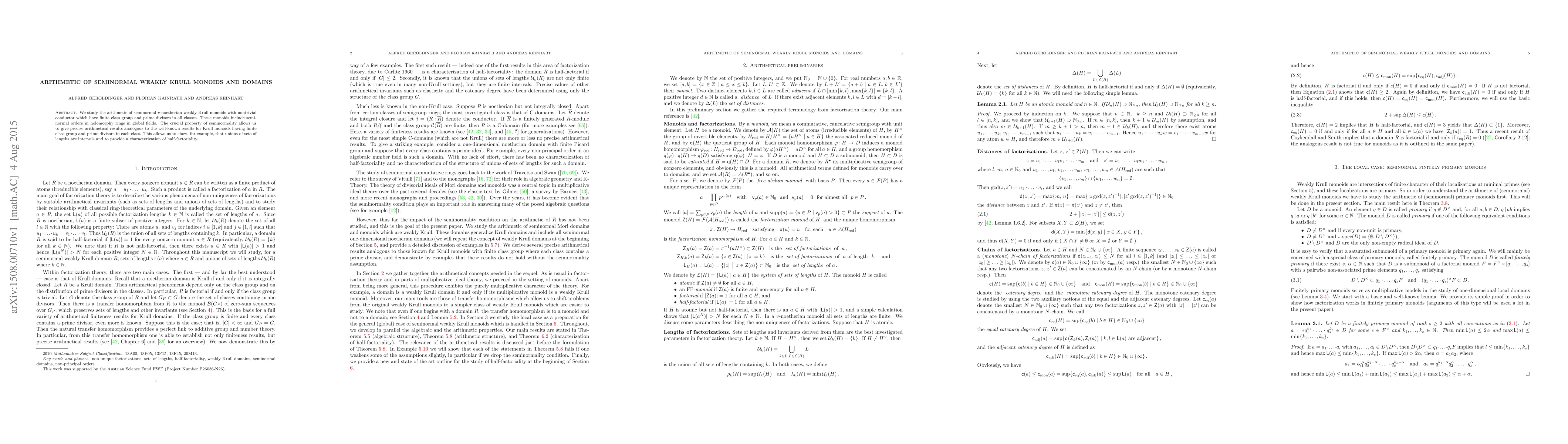 We study the arithmetic of seminormal $v$-noetherian weakly Krull monoids with nontrivial conductor which have finite class group and prime divisors in all classes. These monoids include seminormal orders in holomorphy rings in global fields. The crucial property of seminormality allows us to give precise arithmetical results analogous to the well-known results for Krull monoids having finite class group and prime divisors in each class. This allows us to show, for example, that unions of sets of lengths are intervals and to provide a characterization of half-factoriality.
