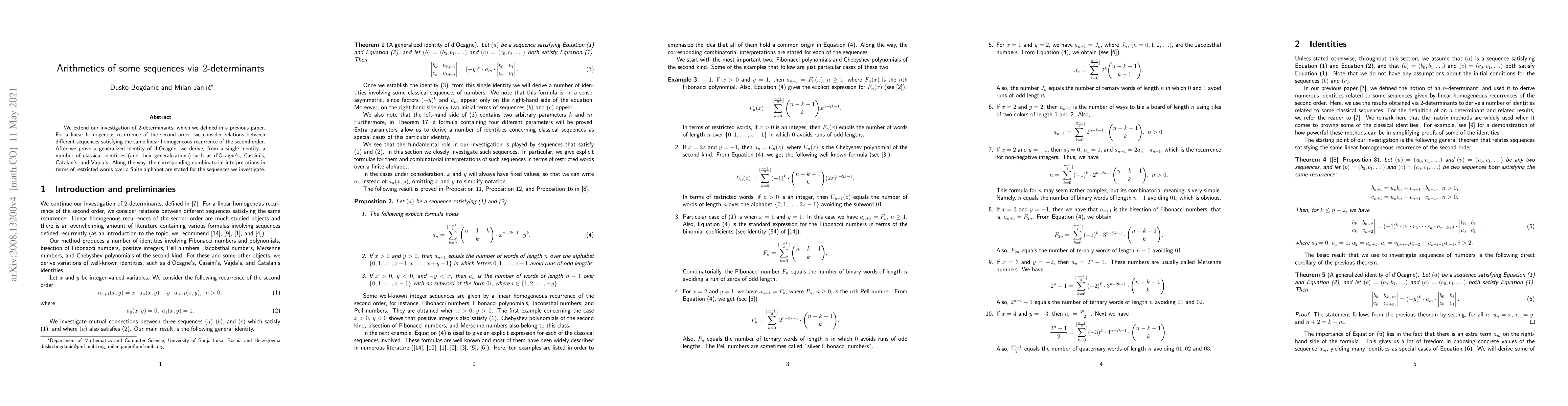 We extend our investigation of $2$-determinants, which we defined in a previous paper. For a linear homogenous recurrence of the second order, we consider relations between different sequences satisfying the same linear homogeneous recurrence of the second order. After we prove a generalized identity of d'Ocagne, we derive, from a single identity, a number of classical identities (and their generalizations) such as d'Ocagne's, Cassini's, Catalan's and Vajda's. Along the way, the corresponding combinatorial interpretations in terms of restricted words over a finite alphabet are stated for the sequences we investigate.