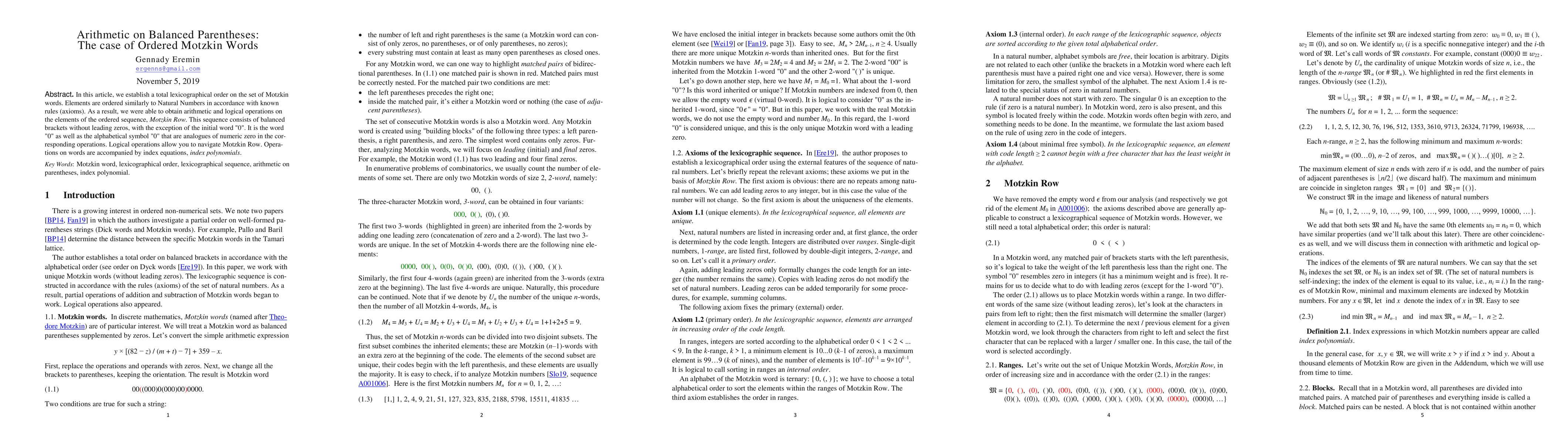 We establish a total lexicographical order on the set of Motzkin words. Elements are ordered similarly to Natural Numbers in accordance with known rules (axioms). As a result, we were able to obtain arithmetic and logical operations on the elements of the ordered sequence, Motzkin Row. This sequence consists of balanced brackets without leading zeros, with the exception of the initial word "0". It is the word "0" as well as the alphabetical symbol "0" that are analogues of numeric zero in the corresponding operations. Logical operations allow you to navigate Motzkin Row. Operations on words are accompanied by index equations, index polynomials.