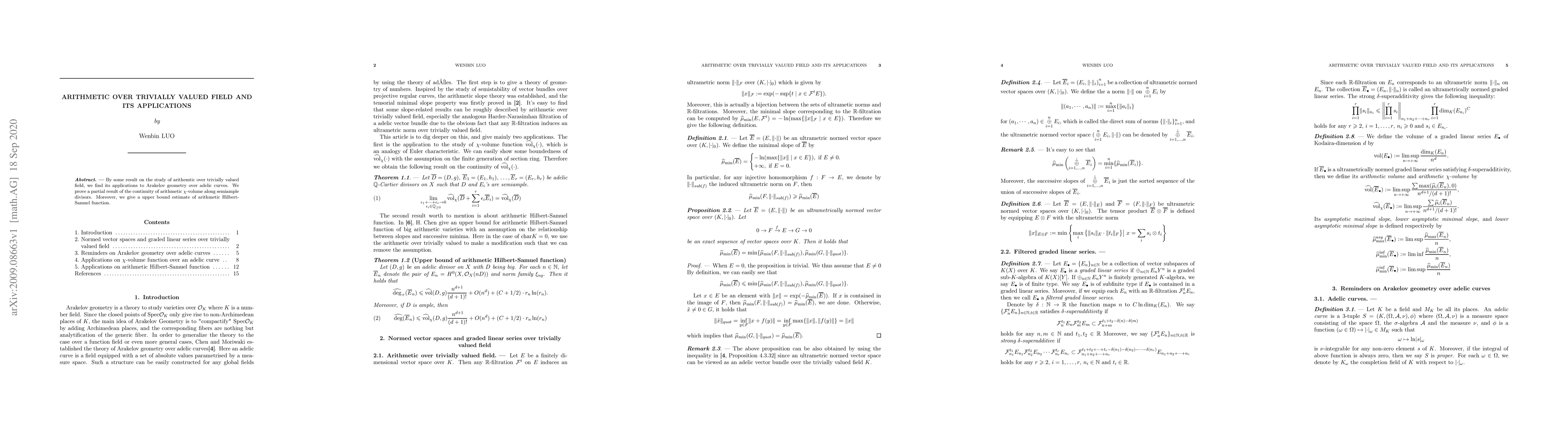 The paper introduces and applies concepts from adelic vector bundles and Arakelov degrees to study arithmetic over trivially valued fields, proving partial continuity results and providing upper bounds for the arithmetic Hilbert-Samuel function.