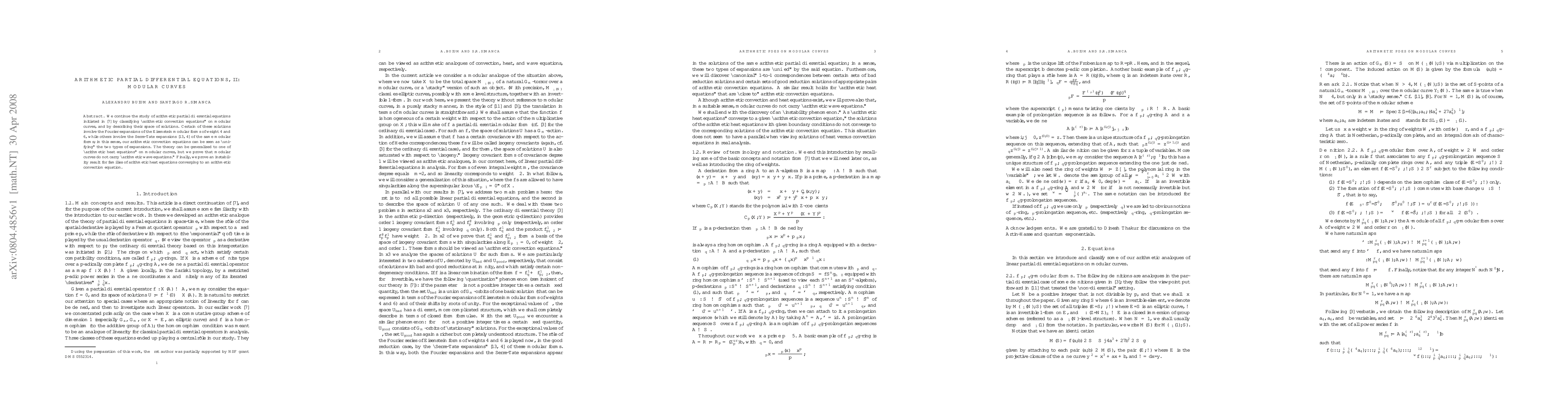 This paper classifies arithmetic convection equations on modular curves and explores their solution spaces, linking Fourier expansions of Eisenstein modular forms of weight 4 and 6 with Serre-Tate expansions. It also extends the theory to arithmetic heat equations and proves the absence of arithmetic wave equations on modular curves, concluding with an instability result for certain converging families of arithmetic heat equations.