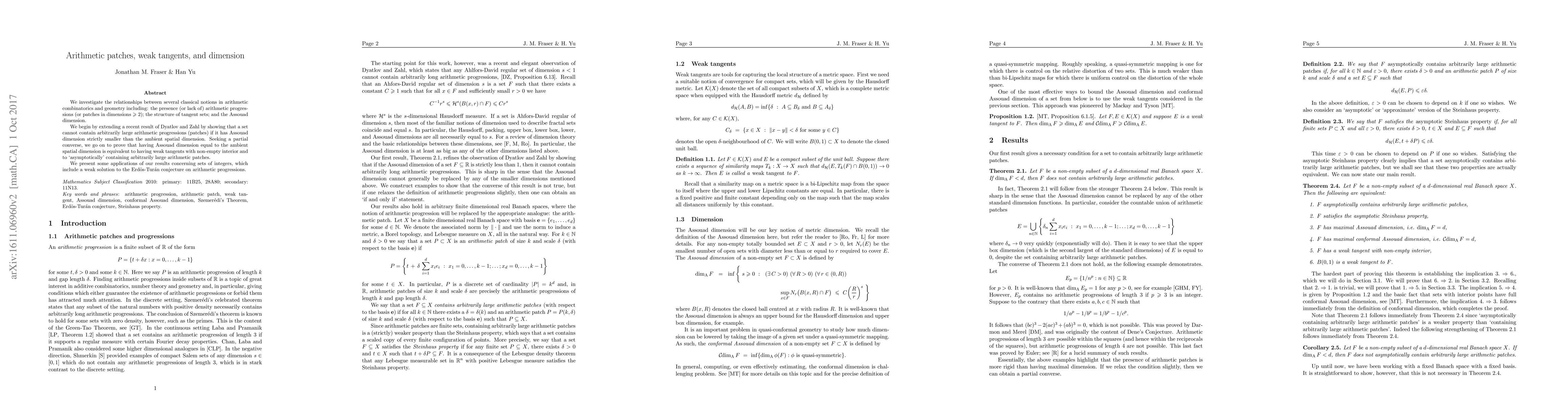 We investigate the relationships between several classical notions in arithmetic combinatorics and geometry including: the presence (or lack of) arithmetic progressions (or patches in dimensions $\geq 2$); the structure of tangent sets; and the Assouad dimension. We begin by extending a recent result of Dyatlov and Zahl by showing that a set cannot contain arbitrarily large arithmetic progressions (patches) if it has Assouad dimension strictly smaller than the ambient spatial dimension. Seeking a partial converse, we go on to prove that having Assouad dimension equal to the ambient spatial dimension is equivalent to having weak tangents with non-empty interior and to `asymptotically' containing arbitrarily large arithmetic patches. We present some applications of our results concerning sets of integers, which include a weak solution to the Erd\"os-Tur\'an conjecture on arithmetic progressions.