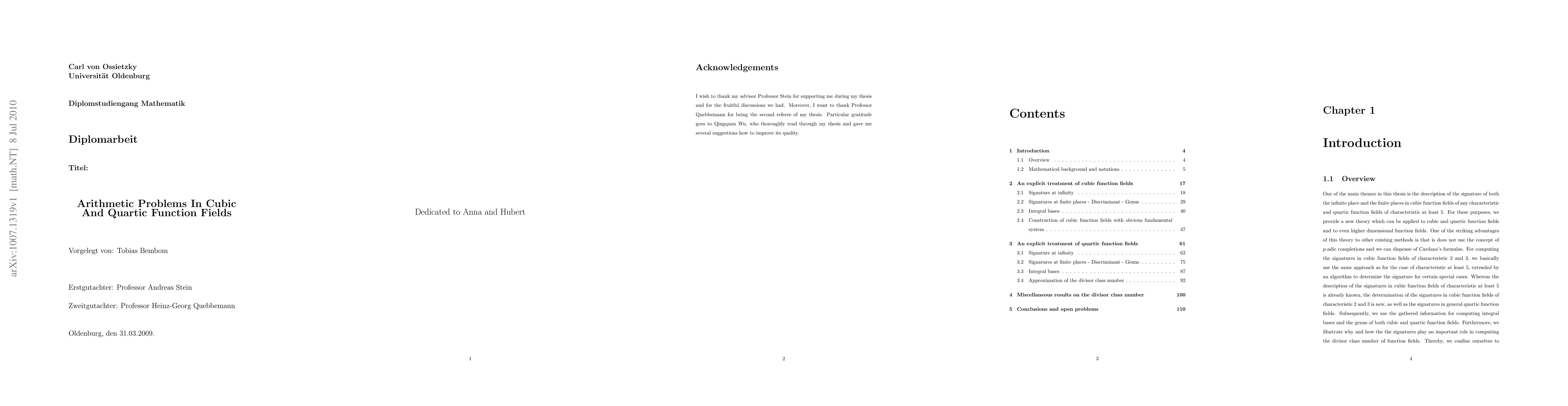 One of the main themes in this thesis is the description of the signature of both the infinite place and the finite places in cubic function fields of any characteristic and quartic function fields of characteristic at least 5. For these purposes, we provide a new theory which can be applied to cubic and quartic function fields and to even higher dimensional function fields. One of the striking advantages of this theory to other existing methods is that is does not use the concept of p-adic completions and we can dispense of Cardano's formulae. Another key result comprises the construction of cubic function fields of unit rank 1 and 2, with an obvious fundamental system. One of the main ingredients for such constructions is the definition of the maximum value. This definition is new and very prolific in the context of finding fundamental systems. We conclude the thesis with miscellaneous results on the divisor class number h, including a new approach for finding divisors of h.