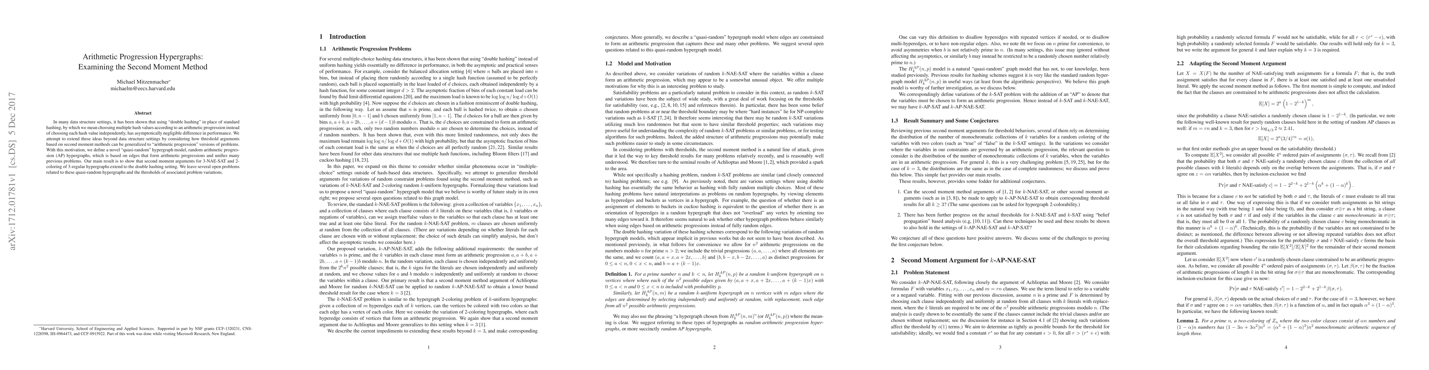 This paper explores the application of second moment methods to "arithmetic progression" hypergraphs, which are quasi-random structures based on edges forming arithmetic progressions. The study extends double hashing ideas from data structures to show that second moment arguments for 3-NAE-SAT and 2-coloring of 3-regular hypergraphs remain valid in this new setting.