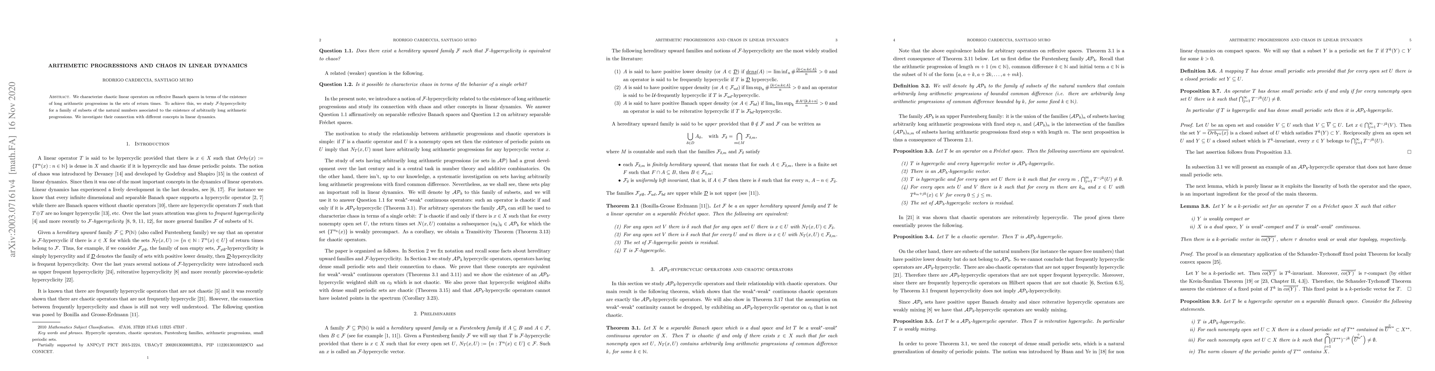 We characterize chaotic linear operators on reflexive Banach spaces in terms of the existence of long arithmetic progressions in the sets of return times. To achieve this, we study $\mathcal F$-hypercyclicity for a family of subsets of the natural numbers associated with the existence of arbitrarily long arithmetic progressions. We investigate their connection with different concepts in linear dynamics.