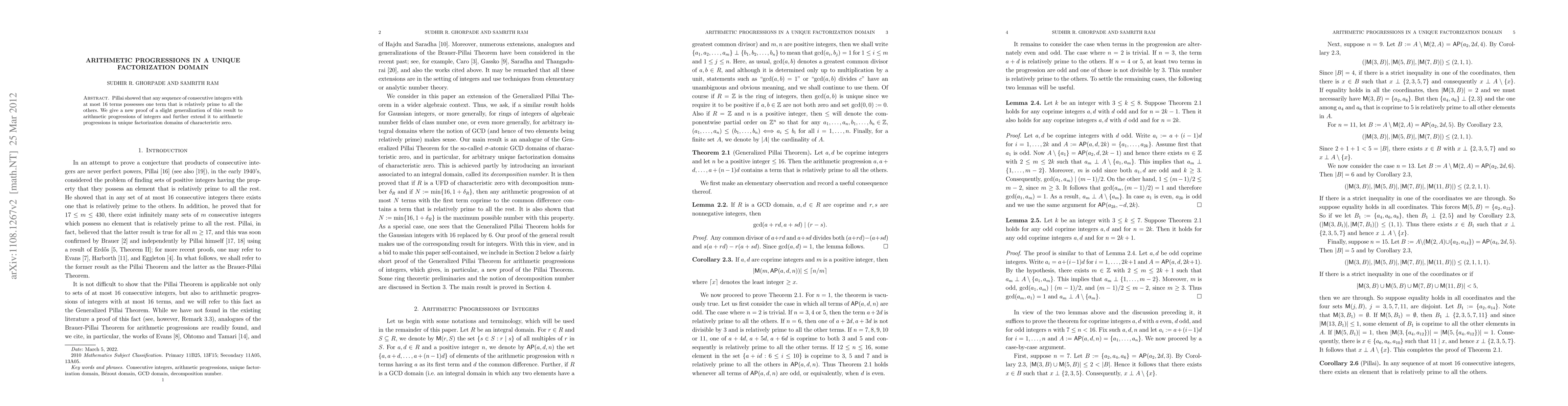 Pillai showed that any sequence of consecutive integers with at most 16 terms possesses one term that is relatively prime to all the others. We give a new proof of a slight generalization of this result to arithmetic progressions of integers and further extend it to arithmetic progressions in unique factorization domains of characteristic zero.