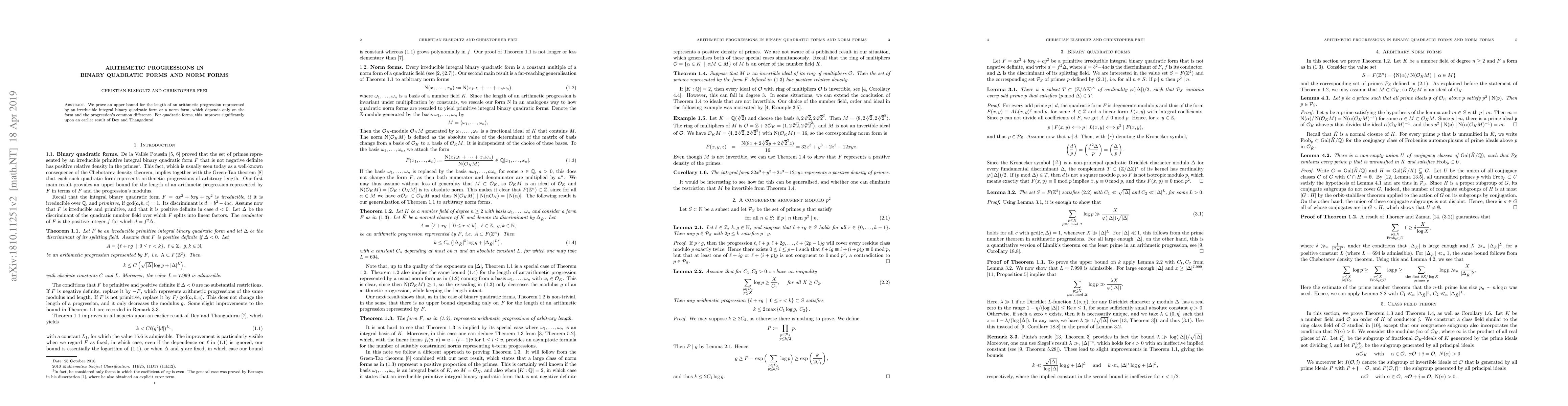 We prove an upper bound for the length of an arithmetic progression represented by an irreducible integral binary quadratic form or a norm form, which depends only on the form and the progression's common difference. For quadratic forms, this improves significantly upon an earlier result of Dey and Thangadurai.