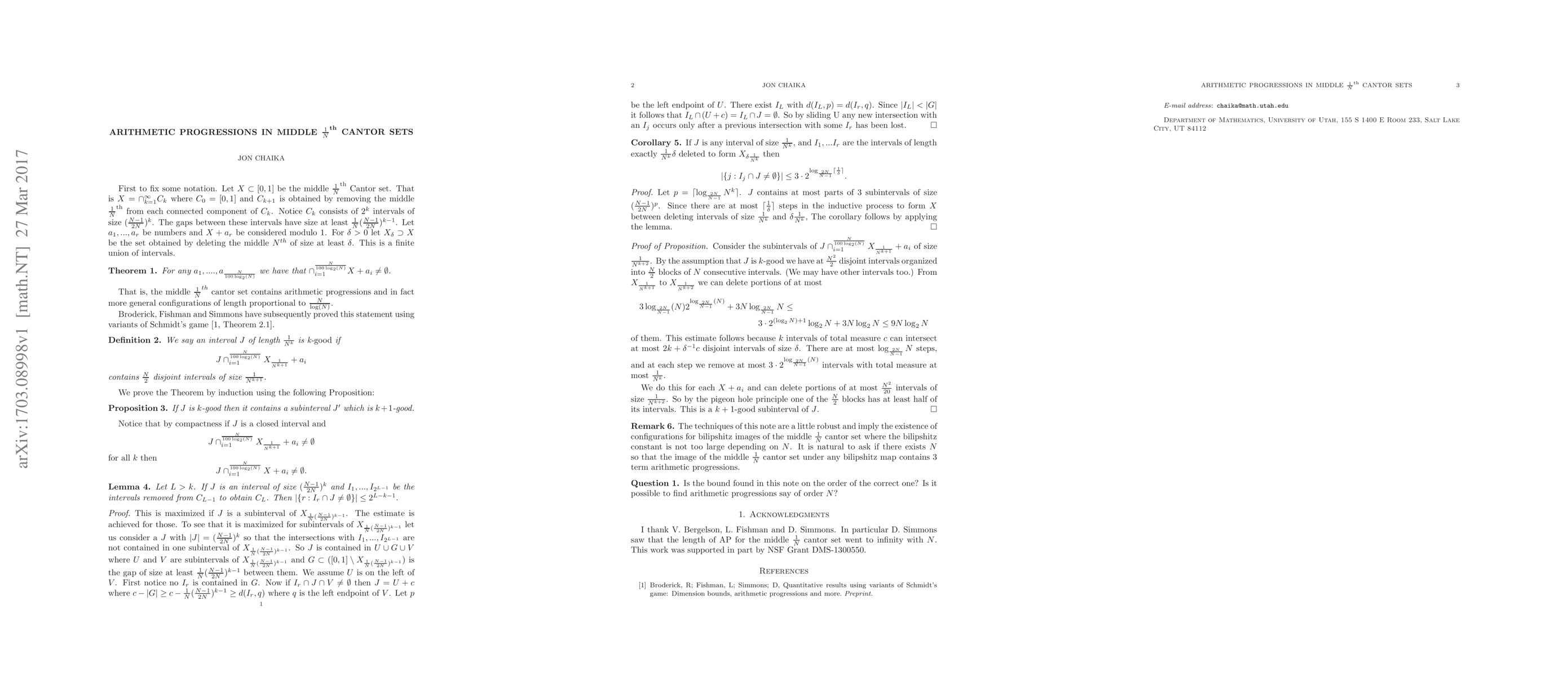 Summary: The research demonstrates that the middle Nth Cantor set contains arithmetic progressions of length proportional to N/log_2(N), highlighting a significant structural property of these sets. This finding contributes to the understanding of combinatorial patterns within fractal sets.