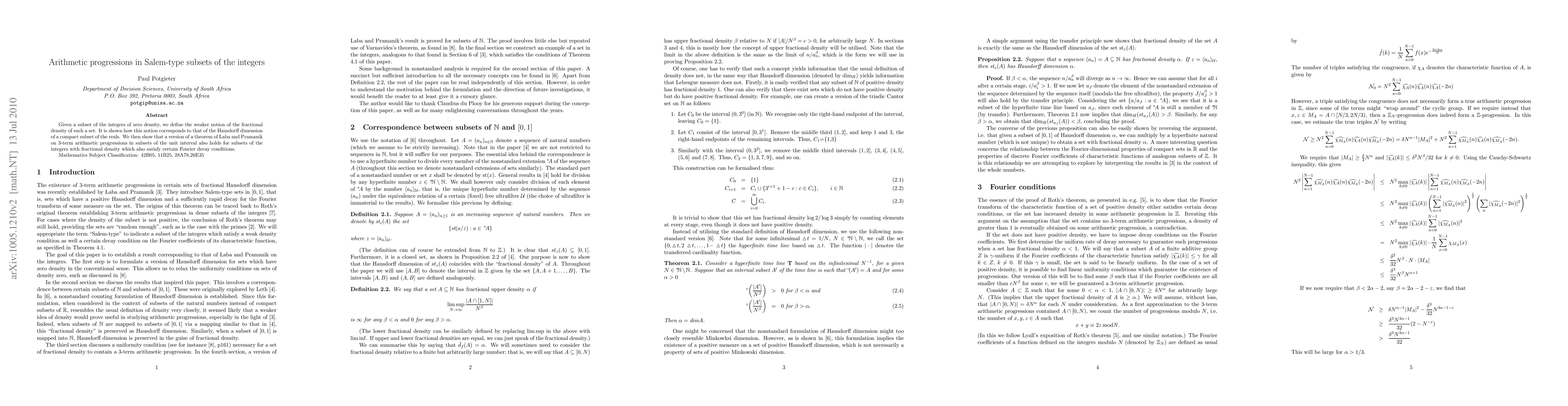 This paper explores subsets of the integers with fractional density, linking this concept to the Hausdorff dimension. It extends a theorem on 3-term arithmetic progressions from unit intervals to integer subsets with fractional density and specific Fourier-decay conditions.