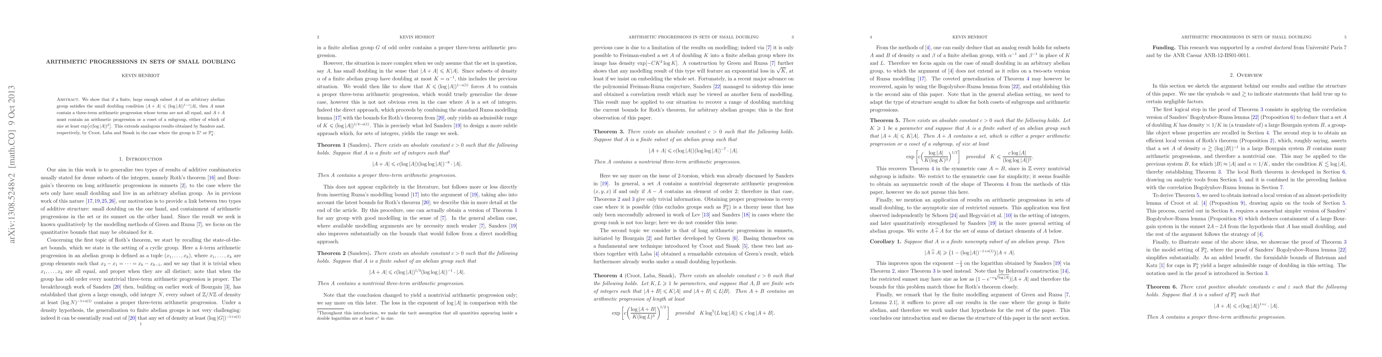 We show that if a finite, large enough subset A of an arbitrary abelian group satisfies the small doubling condition |A + A| < (log |A|)^{1 - epsilon} |A|, then A must contain a three-term arithmetic progression whose terms are not all equal, and A + A must contain an arithmetic progression or a coset of a subgroup, either of which of size at least exp^[ c (log |A|)^{delta} ]. This extends analogous results obtained by Sanders and, respectively, by Croot, Laba and Sisask in the case where the group is that of the integers or a finite field.