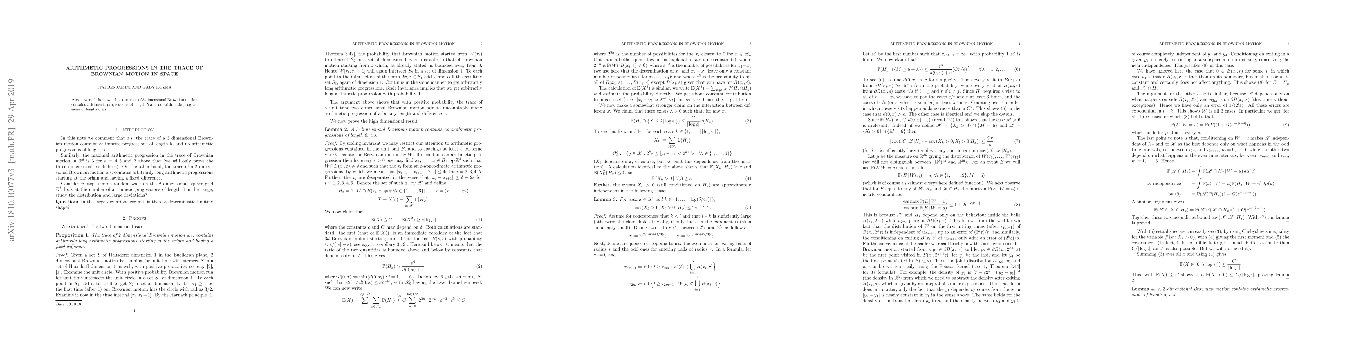 It is shown that the trace of $3$ dimensional Brownian motion contains arithmetic progressions of length $5$ and no arithmetic progressions of length $6$ a.s.