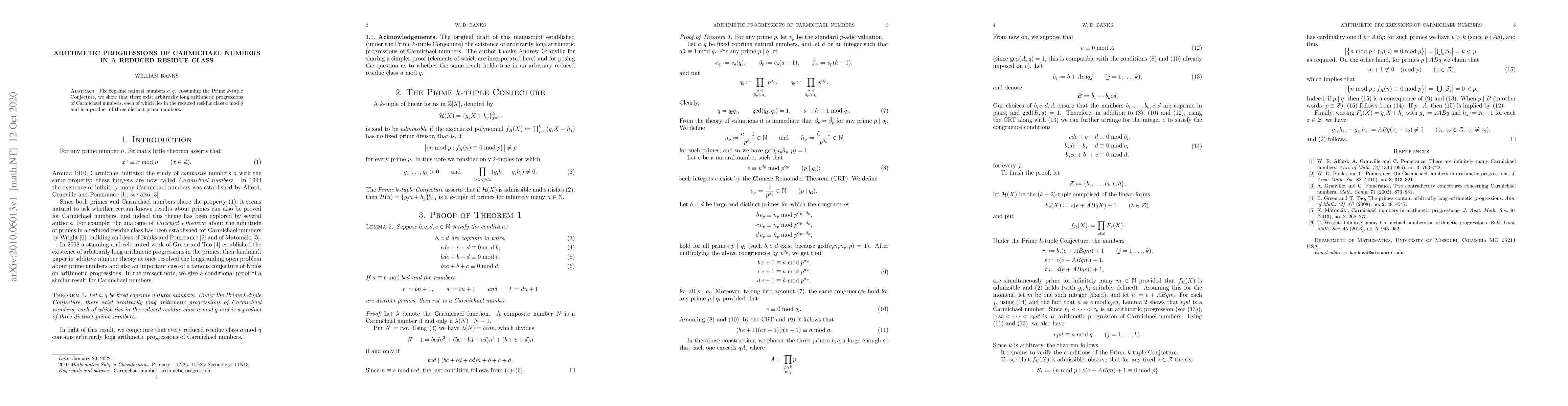 Summary: Under the Prime $k$-tuple Conjecture, the paper demonstrates the existence of long arithmetic progressions of Carmichael numbers, each congruent to $a$ mod $q$ and composed of three distinct primes. This finding reveals a deeper structure within these special numbers.