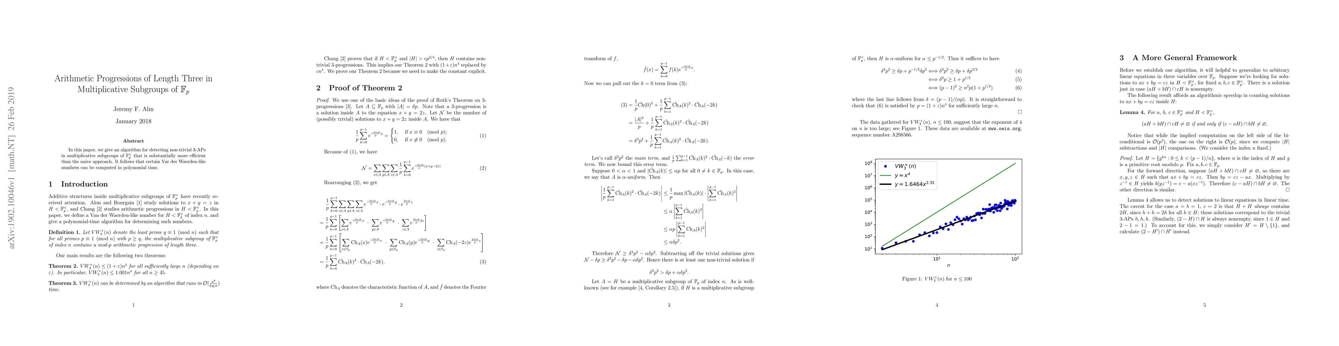 The paper presents an algorithm for detecting non-trivial 3-term arithmetic progressions (3-APs) in multiplicative subgroups of $\mathbb{F}_p^\times$, which is more efficient than the naive approach. It utilizes properties of multiplicative groups and linear equations in three variables over $\mathbb{F}_p$.