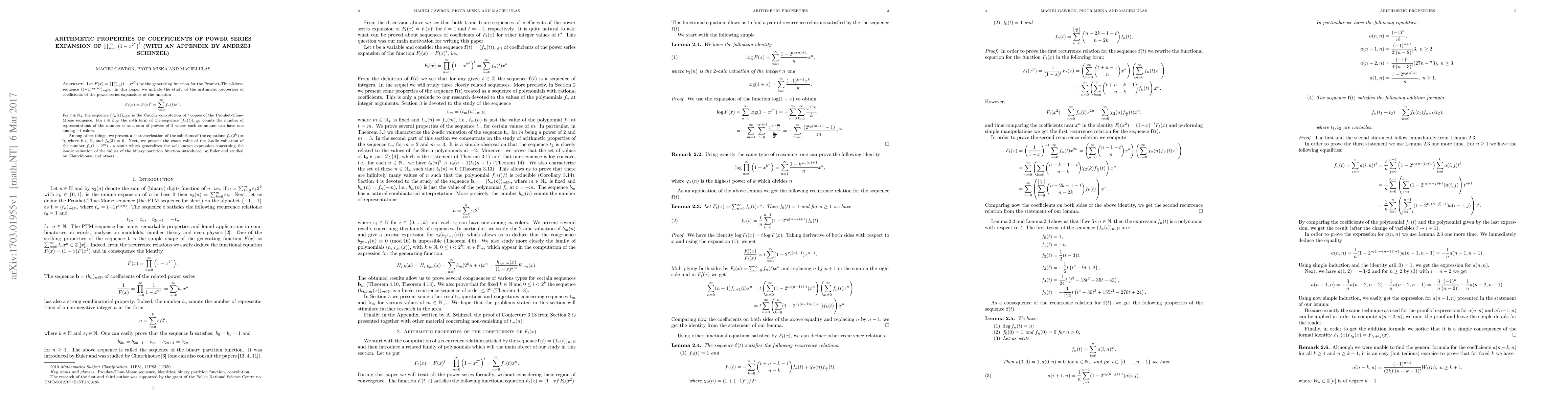 Let $F(x)=\prod_{n=0}^{\infty}(1-x^{2^{n}})$ be the generating function for the Prouhet-Thue-Morse sequence $((-1)^{s_{2}(n)})_{n\in\N}$. In this paper we initiate the study of the arithmetic properties of coefficients of the power series expansions of the function $$ F_{t}(x)=F(x)^{t}=\sum_{n=0}^{\infty}f_{n}(t)x^{n}. $$ For $t\in\N_{+}$ the sequence $(f_{n}(t))_{n\in\N}$ is the Cauchy convolution of $t$ copies of the Prouhet-Thue-Morse sequence. For $t\in\Z_{<0}$ the $n$-th term of the sequence $(f_{n}(t))_{n\in\N}$ counts the number of representations of the number $n$ as a sum of powers of 2 where each summand can have one among $-t$ colors. Among other things, we present a characterization of the solutions of the equations $f_{n}(2^k)=0$, where $k\in\N$, and $f_{n}(3)=0$. Next, we present the exact value of the 2-adic valuation of the number $f_{n}(1-2^{m})$ - a result which generalizes the well known expression concerning the 2-adic valuation of the values of the binary partition function introduced by Euler and studied by Churchhouse and others.
