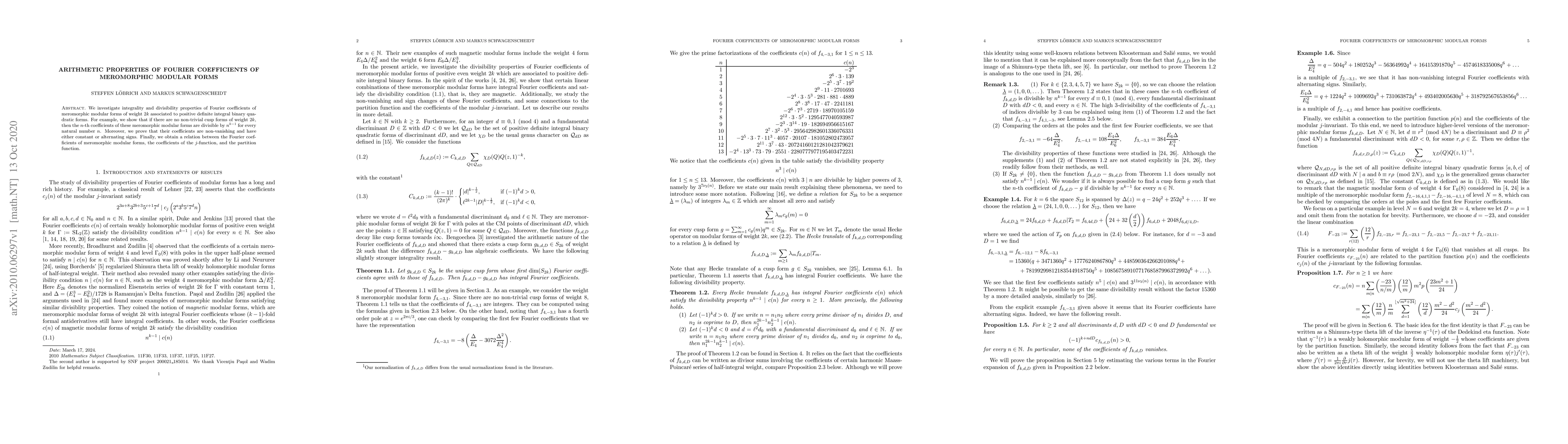 This paper examines the integrality and divisibility of Fourier coefficients of meromorphic modular forms of weight $2k$, showing that under certain conditions, these coefficients are divisible by $n^{k-1}$ and exhibit non-vanishing properties with constant or alternating signs. Additionally, it establishes a connection between these coefficients, the $j$-function, and the partition function.