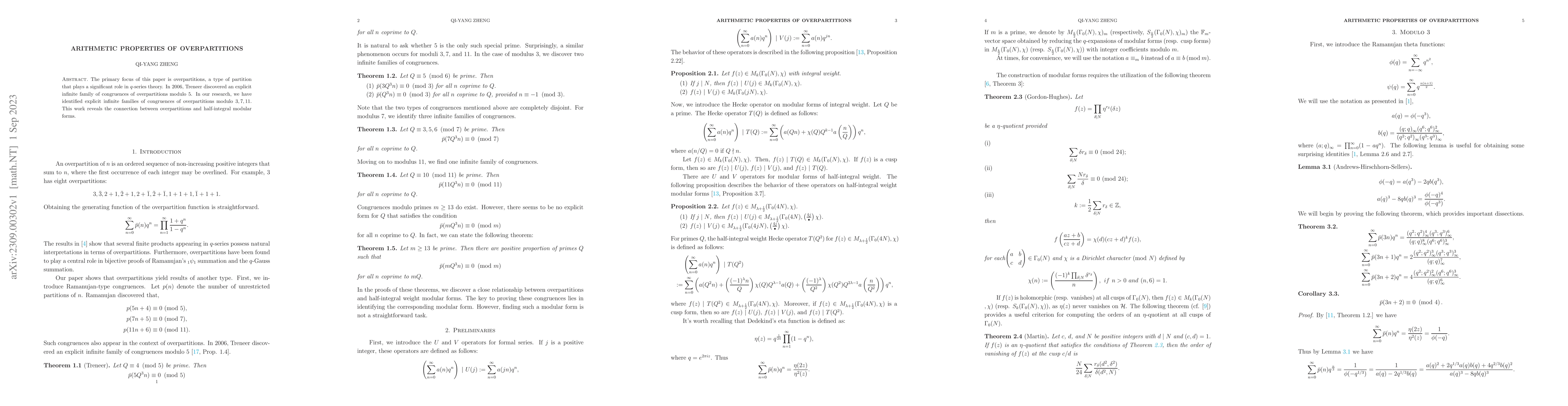 This paper explores arithmetic properties of overpartitions, revealing new infinite families of congruences modulo $3, 7,$ and $11$, extending Treneer's findings from $5$. It uncovers a link between overpartitions and half-integral modular forms.