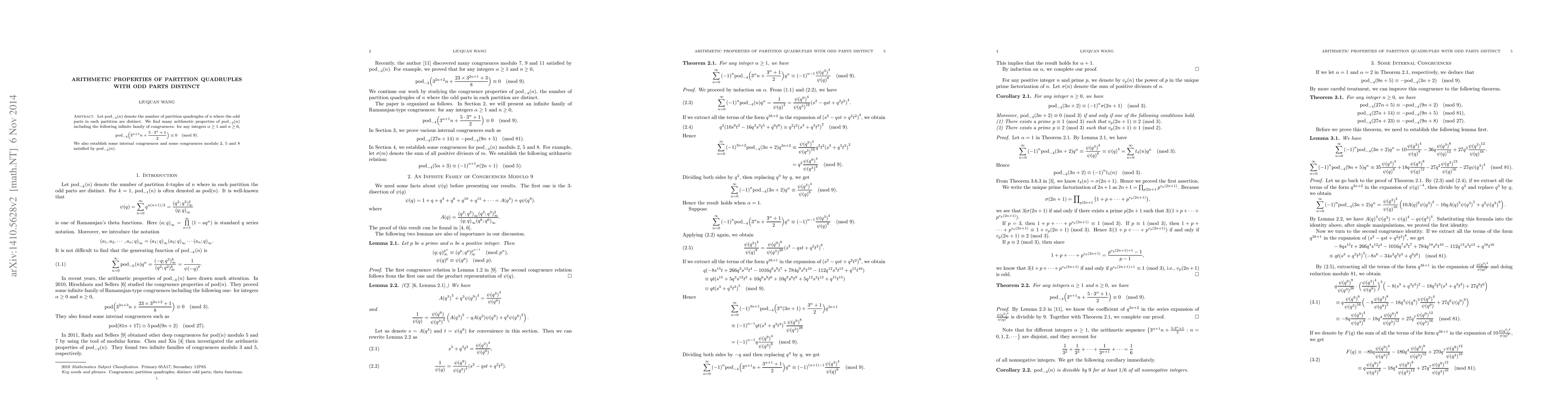 Let $\mathrm{pod}_{-4}(n)$ denote the number of partition quadruples of $n$ where the odd parts in each partition are distinct. We find many arithmetic properties of $\mathrm{pod}_{-4}(n)$ involving the following infinite family of congruences: for any integers $\alpha \ge 1$ and $n \ge 0$, \[\mathrm{pod}_{-4}\Big({{3}^{\alpha +1}}n+\frac{5\cdot {{3}^{\alpha }}+1}{2}\Big)\equiv 0 \pmod{9}.\] We also establish some internal congruences and some congruences modulo 2, 5 and 8 satisfied by $\mathrm{pod}_{-4}(n)$.