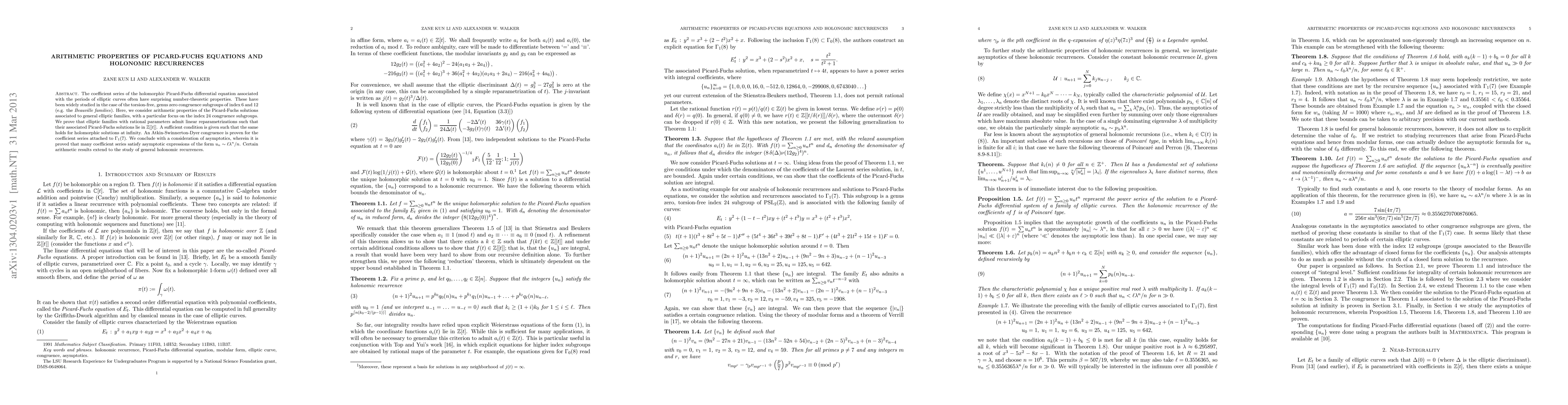 The coefficient series of the holomorphic Picard-Fuchs differential equation associated with the periods of elliptic curves often have surprising number-theoretic properties. These have been widely studied in the case of the torsion-free, genus zero congruence subgroups of index 6 and 12 (e.g. the Beauville families). Here, we consider arithmetic properties of the Picard-Fuchs solutions associated to general elliptic families, with a particular focus on the index 24 congruence subgroups. We prove that elliptic families with rational parameters admit linear reparametrizations such that their associated Picard-Fuchs solutions lie in Z[[t]]. A sufficient condition is given such that the same holds for holomorphic solutions at infinity. An Atkin-Swinnerton-Dyer congruence is proven for the coefficient series attached to \Gamma_1(7). We conclude with a consideration of asymptotics, wherein it is proved that many coefficient series satisfy asymptotic expressions of the form u_n \sim \ell \lambda^n/n. Certain arithmetic results extend to the study of general holonomic recurrences.