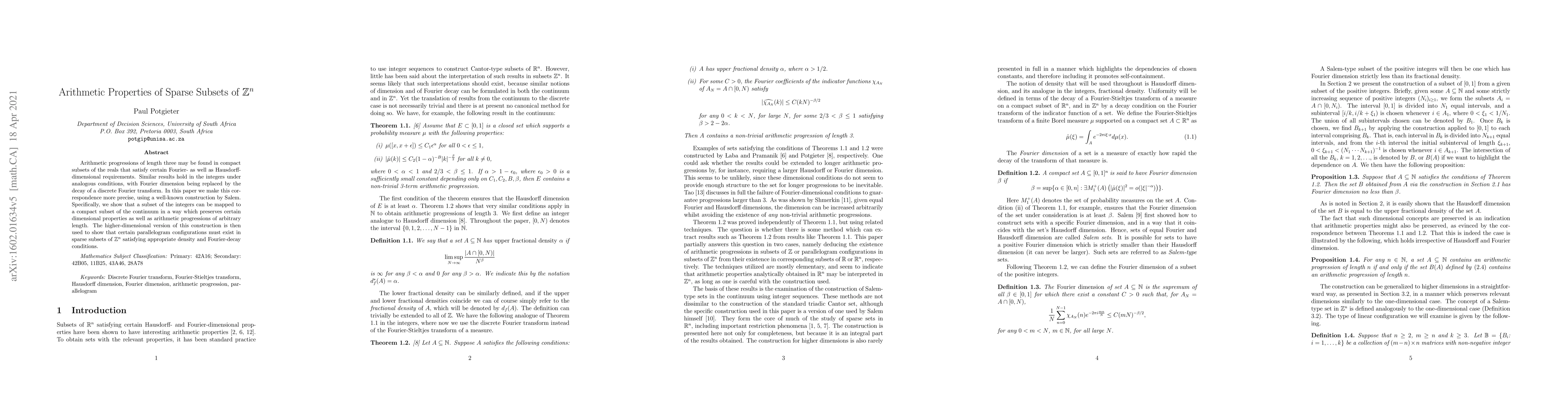 Arithmetic progressions of length $3$ may be found in compact subsets of the reals that satisfy certain Fourier -- as well as Hausdorff -- dimensional requirements. It has been shown that a very similar result holds in the integers under analogous conditions, with Fourier dimension being replaced by the decay of a discrete Fourier transform. In this paper we make this correspondence more precise, using a well-known construction by Salem. Specifically, we show that a subset of the integers can be mapped to a compact subset of the continuum in a way which preserves certain dimensional properties as well as arithmetic progressions of arbitrary length. The higher-dimensional version of this construction is then used to show that certain parallelogram configurations must exist in sparse subsets of $\mathbb{Z}^n$ satisfying appropriate density and Fourier-decay conditions.