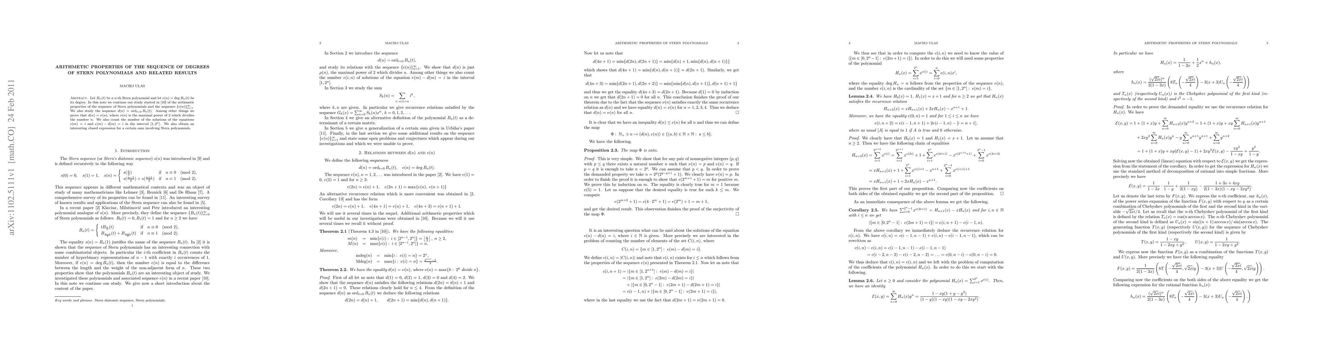 Let $B_{n}(t)$ be a $n$-th Stern polynomial and let $e(n)=\op{deg}B_{n}(t)$ be its degree. In this note we continue our study started in \cite{Ul} of the arithmetic properties of the sequence of Stern polynomials and the sequence $\{e(n)\}_{n=1}^{\infty}$. We also study the sequence $d(n)=\op{ord}_{t=0}B_{n}(t)$. Among other things we prove that $d(n)=\nu(n)$, where $\nu(n)$ is the maximal power of 2 which dividies the number $n$. We also count the number of the solutions of the equations $e(m)=i$ and $e(m)-d(m)=i$ in the interval $[1,2^{n}]$. We also obtain an interesting closed expression for a certain sum involving Stern polynomials.