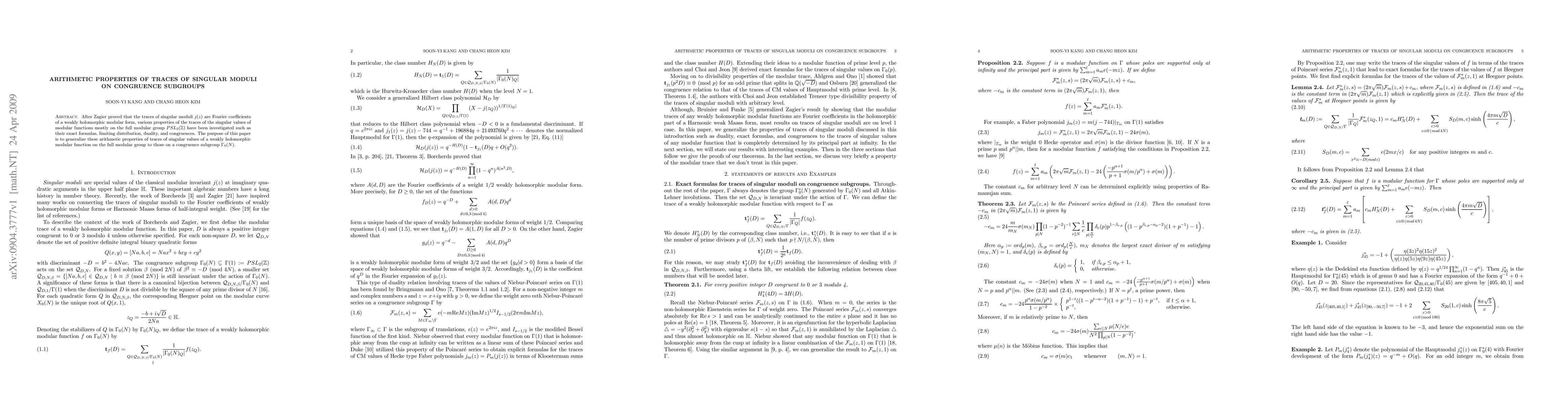 This paper generalizes arithmetic properties of the traces of singular values of weakly holomorphic modular functions, originally studied for the full modular group, to congruence subgroups $\Gamma_0(N)$. It explores their exact formulas, limiting distribution, duality, and congruences within these subgroups.