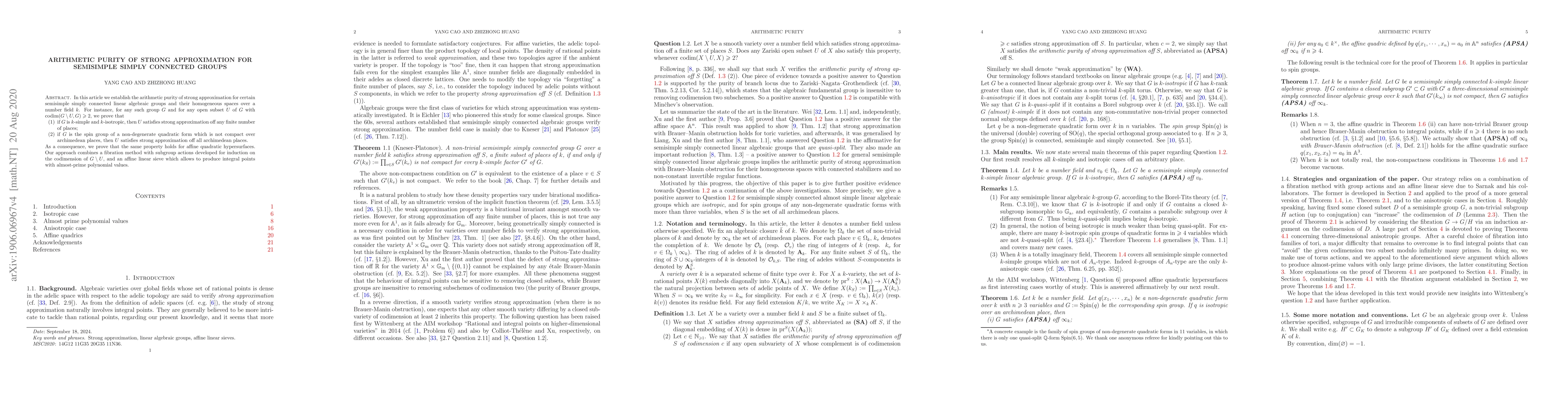 In this article we establish the arithmetic purity of strong approximation for certain semi-simple simply connected $k$-simple linear algebraic groups and their homogeneous spaces over a number field $k$. For instance, for any such group $G$ and for any open subset $U$ of $G$ with codim$(G\setminus U, G)\geq 2$, we prove that (i) if $G$ is $k$-isotropic, then $U$ satisfies strong approximation off any one (hence any finitely many) place; (ii) if $G$ is the spin group of a non-degenerate quadratic form which is non-compact over archimedean places, then $U$ satisfies strong approximation off all archimedean places. As a consequence, we prove that the same property holds for affine quadratic hypersurfaces. Our approach combines a fibration method with subgroup actions developed for induction on the codimension of $G\setminus U$, and an affine combinatorial sieve which allows to produce integral points with almost prime polynomial values.