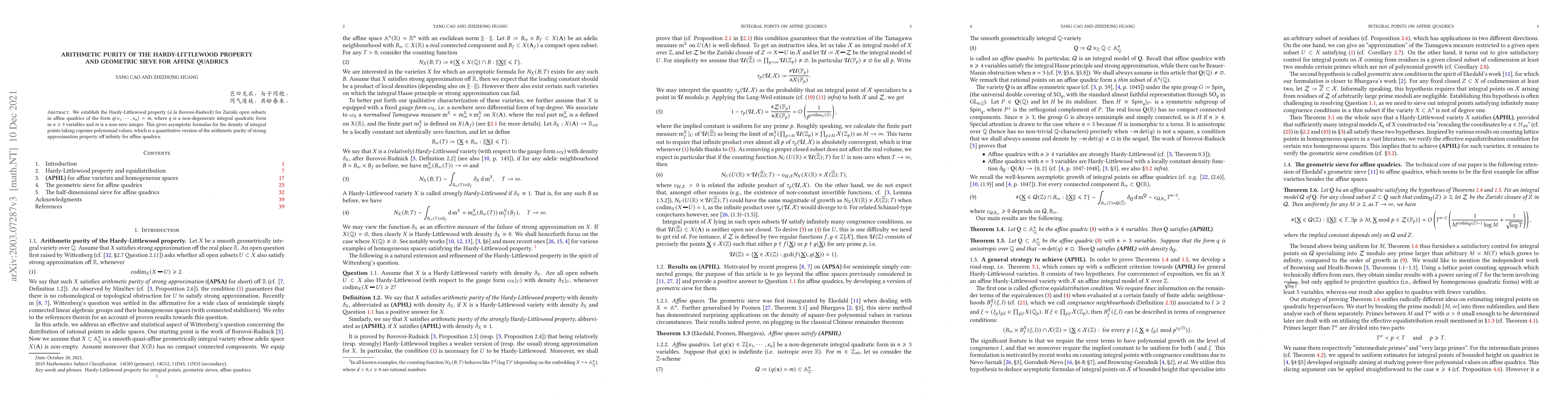 The paper establishes the Hardy-Littlewood property for affine quadrics, providing asymptotic formulas for the density of integral points taking coprime polynomial values, which is a quantitative version of strong approximation for infinite primes.
