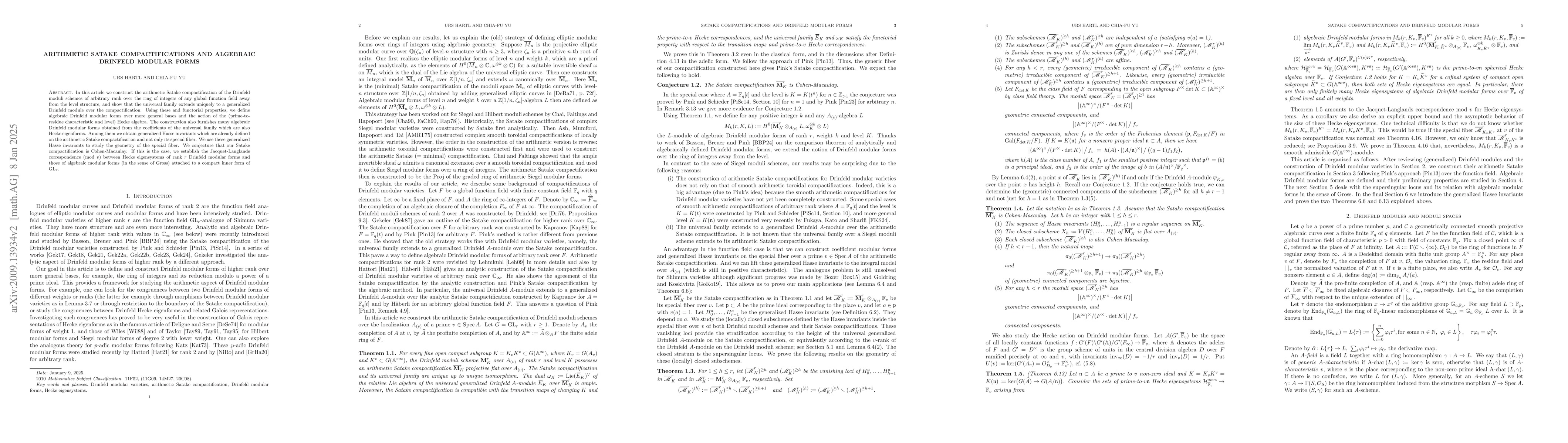 In this article we construct the arithmetic Satake compactification of the Drinfeld moduli schemes of arbitrary rank over the ring of integers of any global function field away from the level structure, and show that the universal family extends uniquely to a generalized Drinfeld module over the compactification. Using these and functorial properties, we define algebraic Drinfeld modular forms over more general bases and the action of the (prime-to-residue characteristic) Hecke algebra. The construction also furnishes many algebraic Drinfeld modular forms obtained from the coefficients of the universal family which are also Hecke eigenforms. Among them we obtain generalized Hasse invariants which already live on the arithmetic Satake compactification. We use these generalized Hasse invariants to study the geometry of the special fiber and to establish the Jacquet-Langlands correspondence (mod $v$) between Hecke eigensystems of rank $r$ Drinfeld modular forms and those of algebraic modular forms (in the sense of Gross) attached to a compact inner form of $GL_r$.