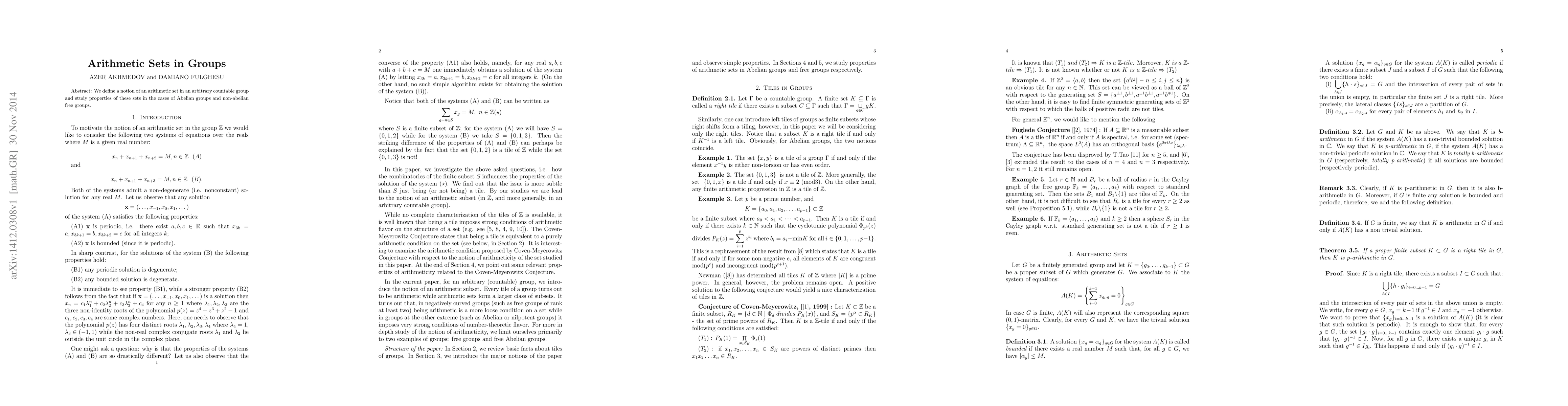 Summary: This paper introduces the concept of arithmetic sets within countable groups, examining their properties specifically in Abelian and non-abelian free groups, and explores the unique characteristics of these sets in each group type.