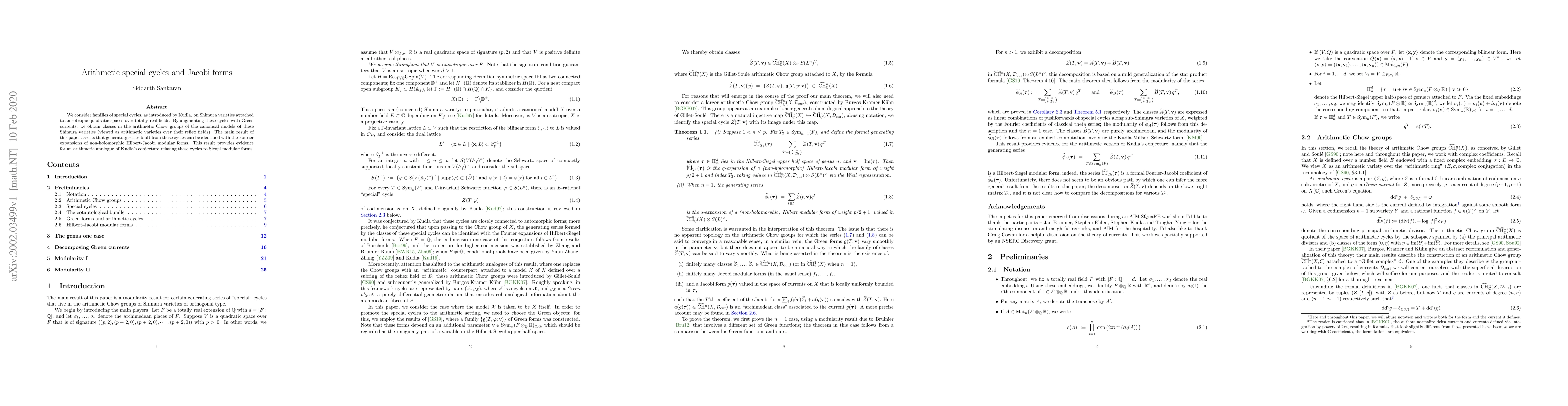 This paper investigates special cycles on Shimura varieties and links them with Green currents to form arithmetic Chow groups. The key finding is that generating series from these cycles correspond to Fourier expansions of non-holomorphic Hilbert-Jacobi modular forms, supporting an arithmetic version of Kudla's conjecture.