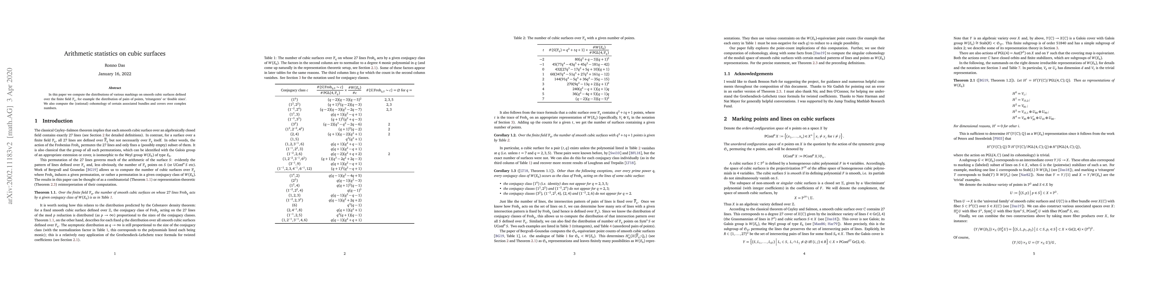 This paper calculates the distributions of specific markings on smooth cubic surfaces over the finite field $\mathbb{F}_q$, including pairs of points and tritangents, and also examines the rational cohomology of related bundles and covers over the complex numbers.