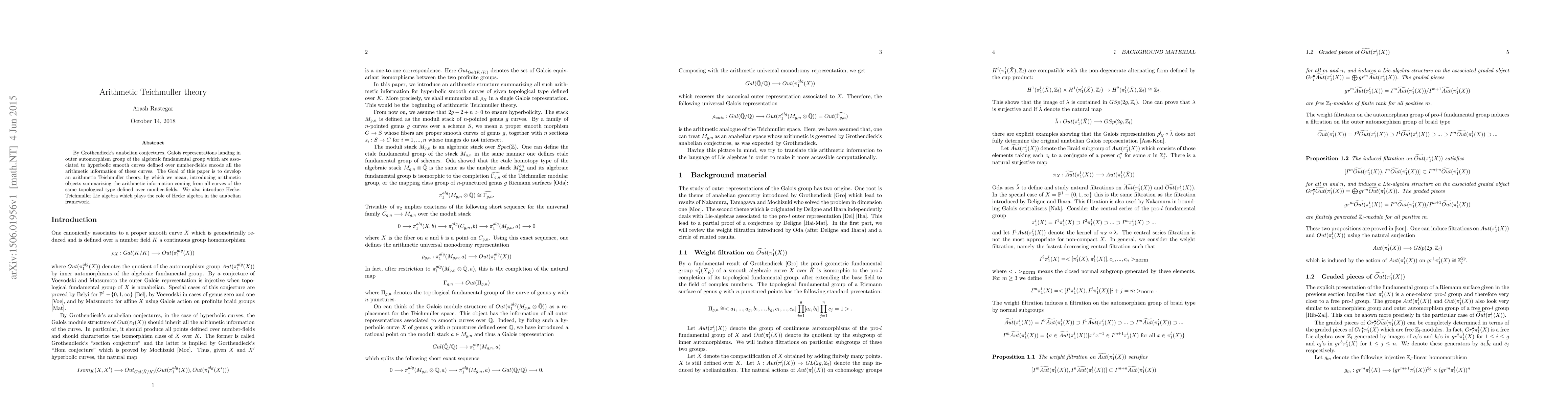 By Grothendieck's anabelian conjectures, Galois representations landing in outer automorphism group of the algebraic fundamental group which are associated to hyperbolic smooth curves defined over number-fields encode all the arithmetic information of these curves. The Goal of this paper is to develop an arithmetic Teichmuller theory, by which we mean, introducing arithmetic objects summarizing the arithmetic information coming from all curves of the same topological type defined over number-fields. We also introduce Hecke-Teichmuller Lie algebra which plays the role of Hecke algebra in the anabelian framework.