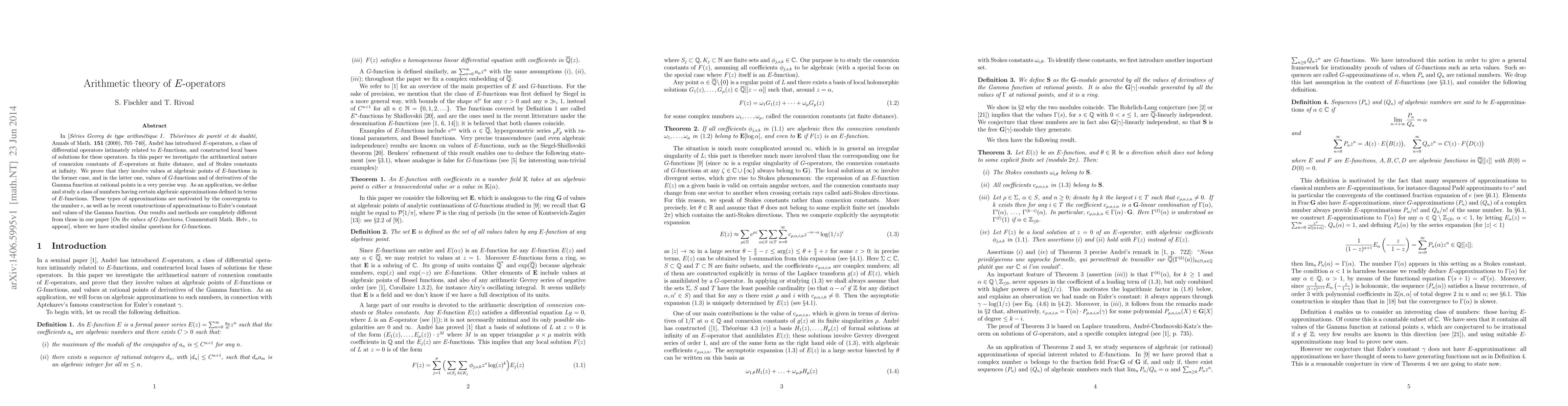 This paper explores the arithmetic nature of connexion constants and Stokes constants of E-operators, revealing that they involve values of E-functions at algebraic points and G-functions and derivatives of the Gamma function at rational points. It also introduces a class of numbers defined by algebraic approximations related to E-functions, distinct from previous studies on G-functions.